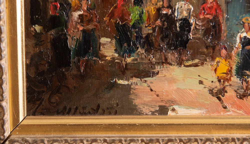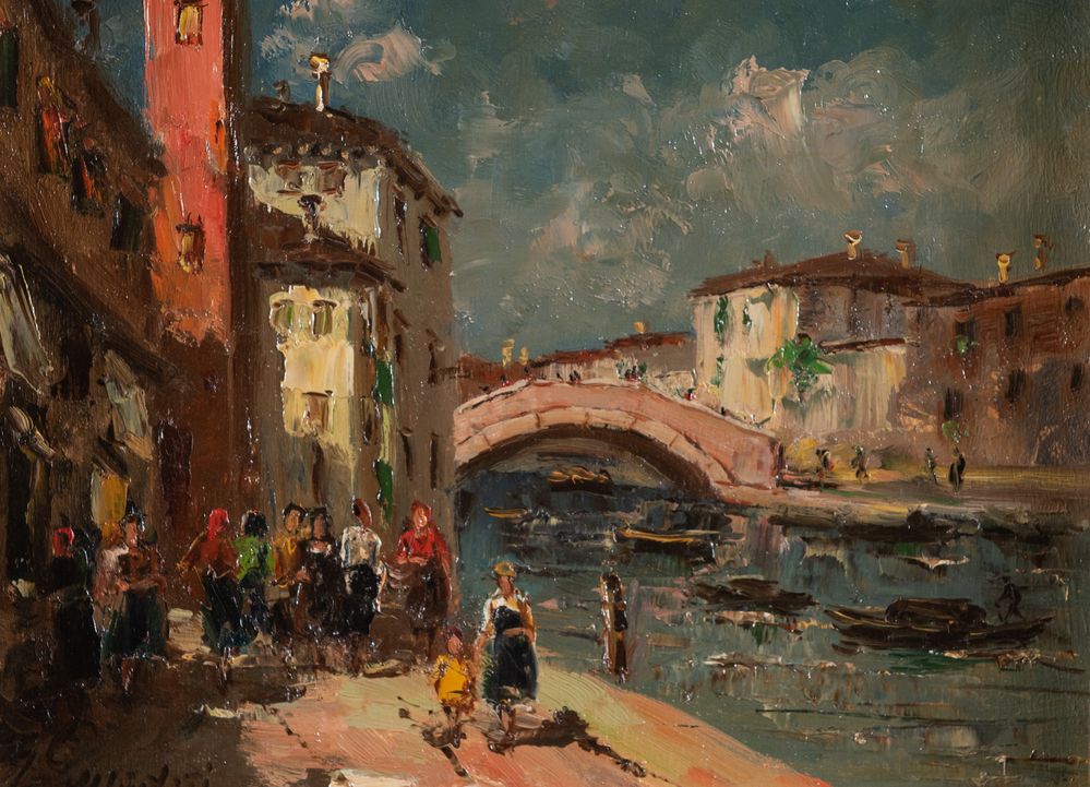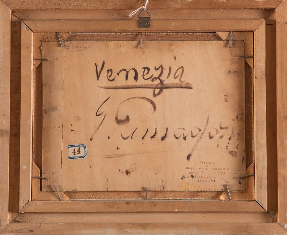 GIULIANO AMADORI (Bologna 1883 - 1972) "Venezia". Olio su tavola. Cm 22,5x30. Opera firmata in basso a sinistra G. Amadori. Al retro opera intitolata e firmata G. Amadori. Al retro reca timbro Amadori Giuliano.