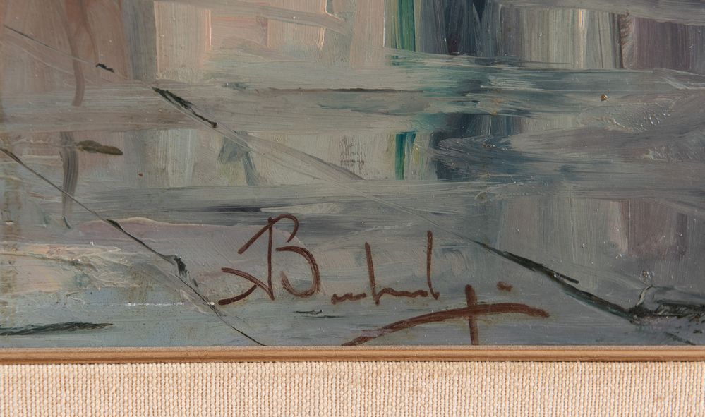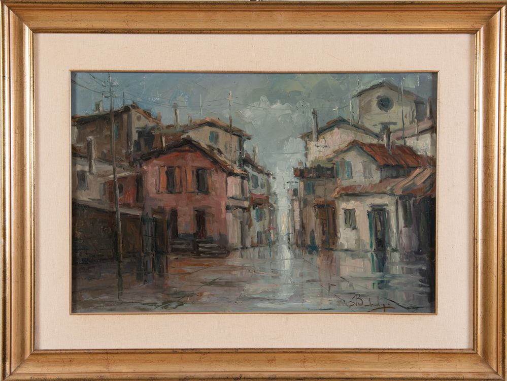 AURELIO BARBALONGA (Palermo 1922 - Bologna 2004) "Scorcio su città". Olio su faesite. Cm 40x60. Opra firmata in basso a destra A. Barbalonga.