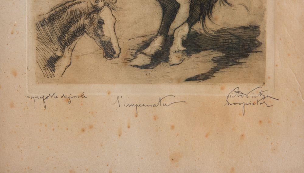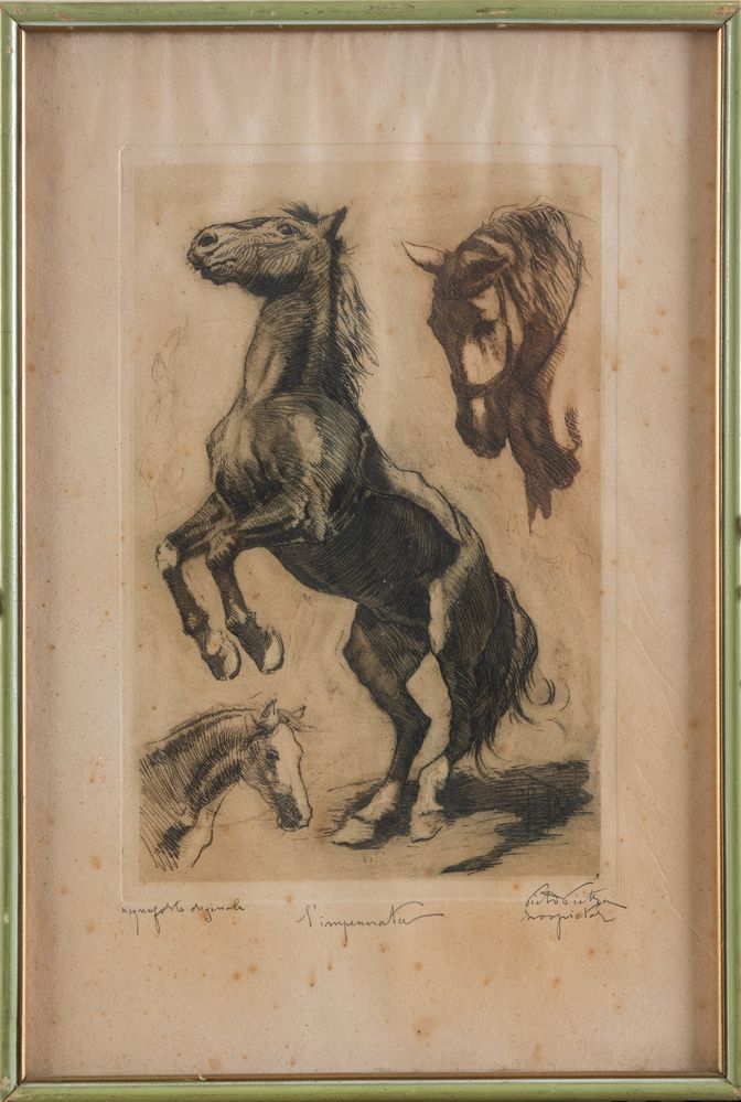 PIETRO PIETRA (Bologna 1885 - 1956) “L'impennata”. Acquaforte su carta. Lastra: cm 25x16,7. Opera intitolata in basso al centro l'impennata. Opera firmata in basso a destra Pietro Pietra.