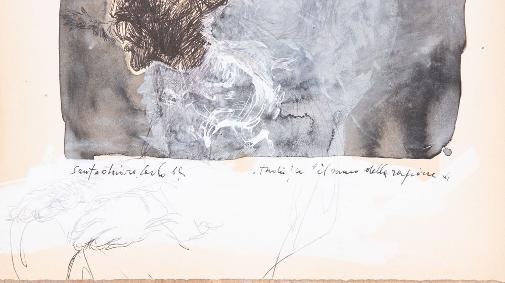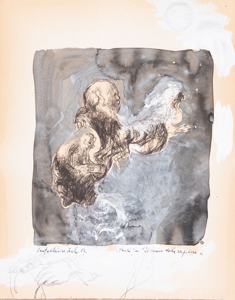 CARLO SANTACHIARA (Reggiolo 1937 - Bologna 2000) "Studio per il sonno della ragione", 1964. Tecnica mista su carta. Cm 30x23. Opera firmata e datata in basso a sinistra Santachiara Carlo '64. Intitolata in basso a destra Studio per il sonno della ragione.