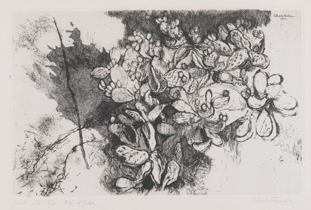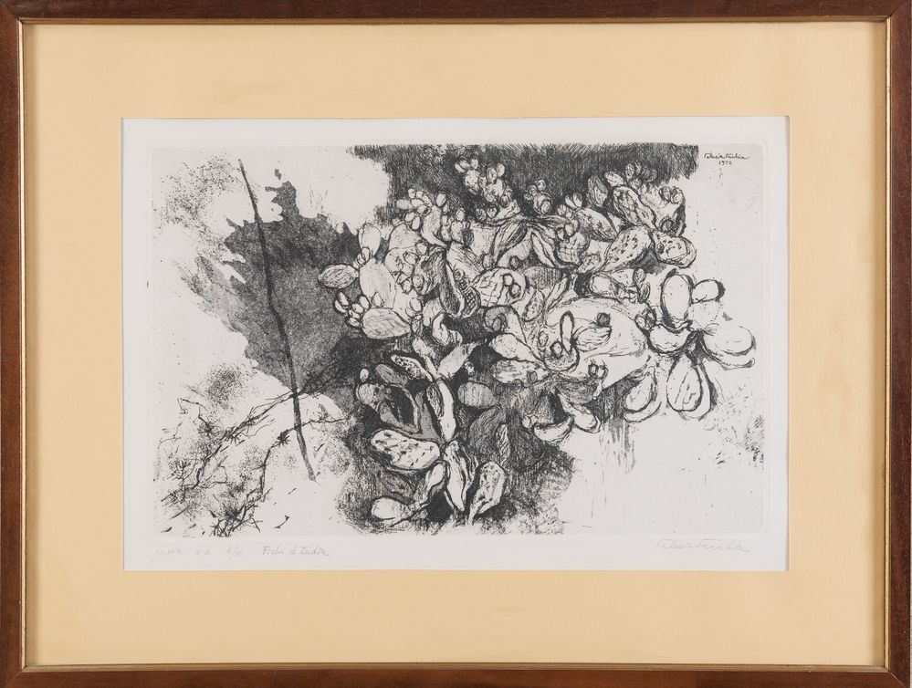 VALERIA VECCHIA (Napoli 1913 - Roma 1986) "Fichi d'India", 1972. Incisione su carta. Lastra: cm 31x49. Opera firmata in basso a destra Valeria Vecchia. Opera intitolata in basso al centro Fichi d'India. Reca numeri di tiratura in basso a sinistra Prova d'autore 4/10.