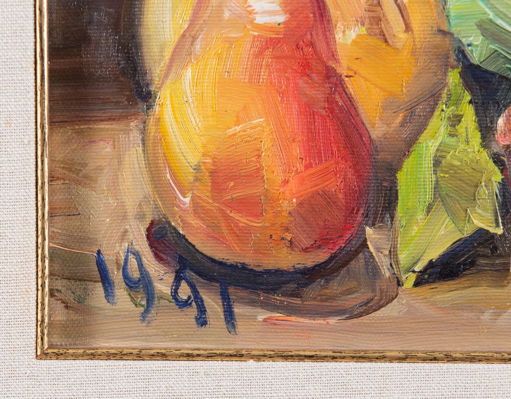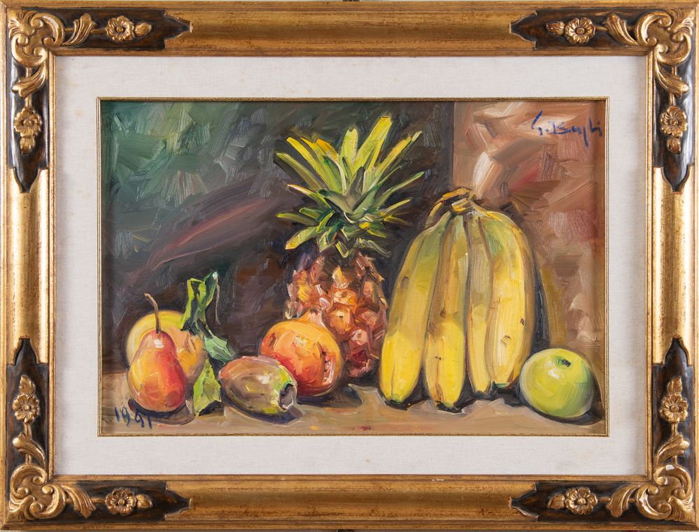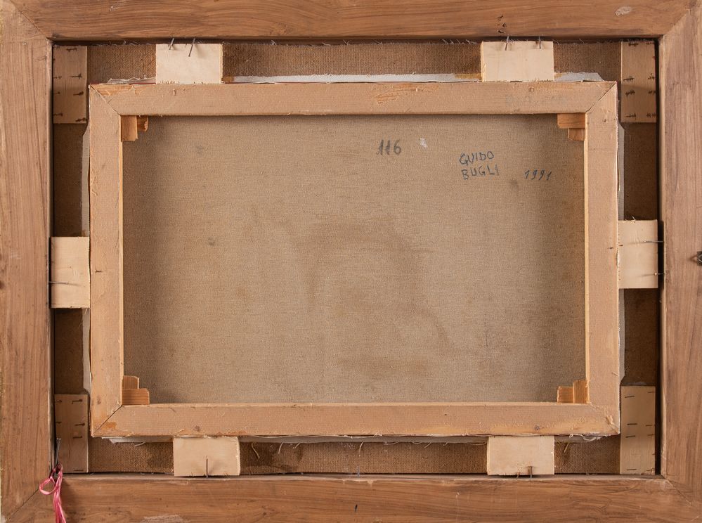 GUIDO BUGLI (Bologna 1912 - 2003) "Natura morta", 1991. Olio su tela. Cm 40,3x60. Opera firmata in alto a destra G. Bugli. Opera datata in basso a sinistra 1991. Al retro opera firmata e datata Guido Bugli 1991.
