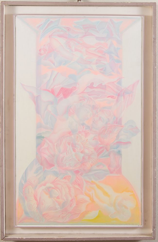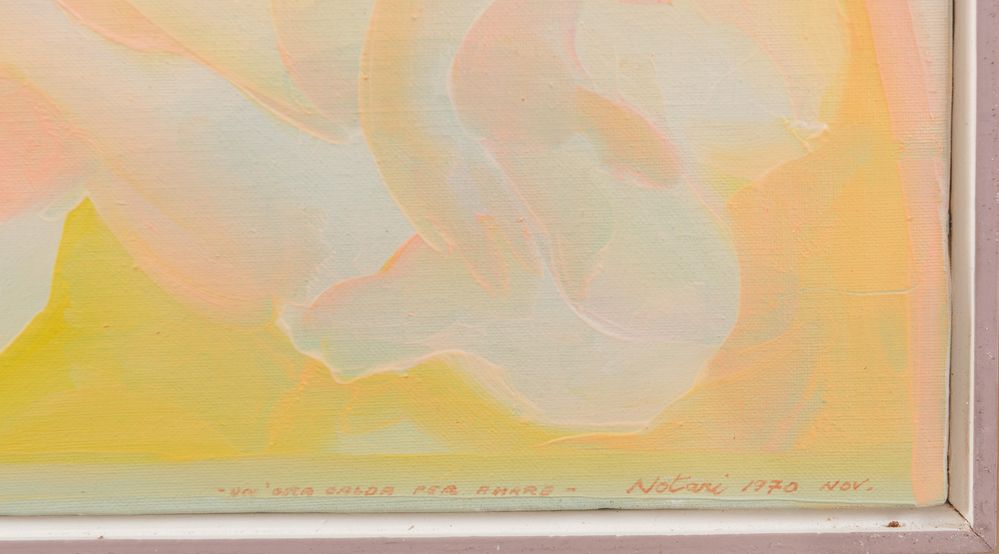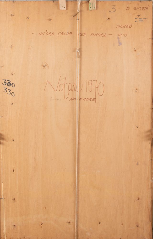 ROMANO NOTARI (Foligno 1933) "Un'ora calda per amare", 1970. Tecnica mista su tela. Cm 100x60. Opera intitolata, firmata e datata in basso a destra Un'ora calda per amare, Notari, 1970. Al retro opera intitolata, firmata e datata Un'ora calda per amare, Notari, 1970.