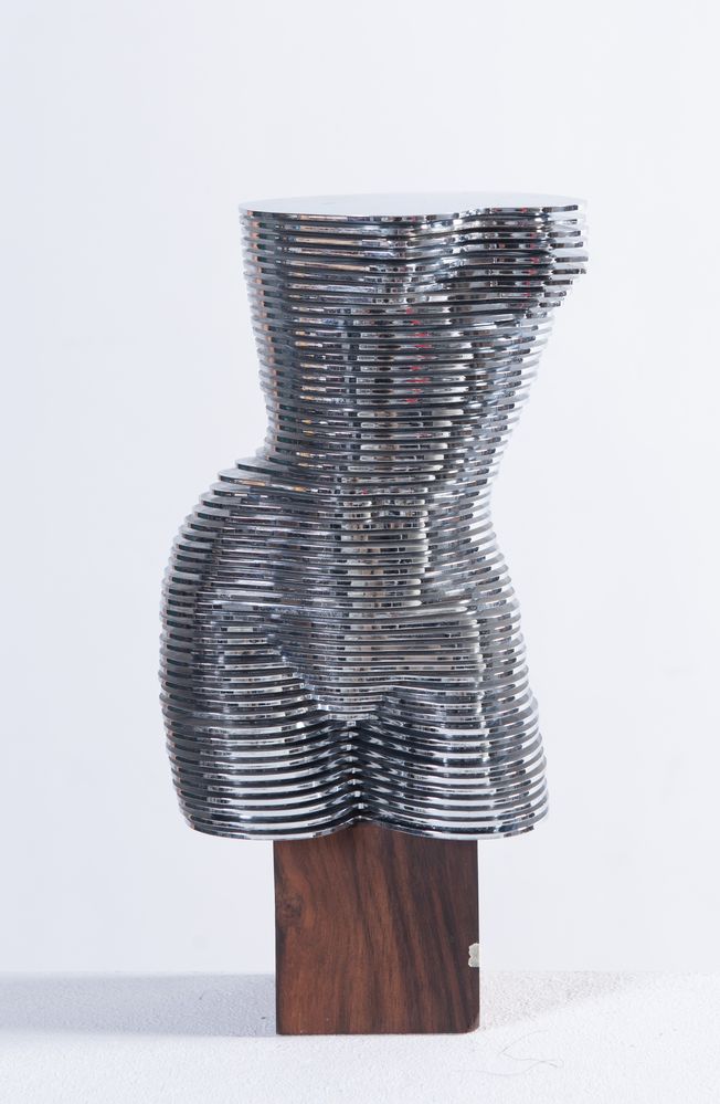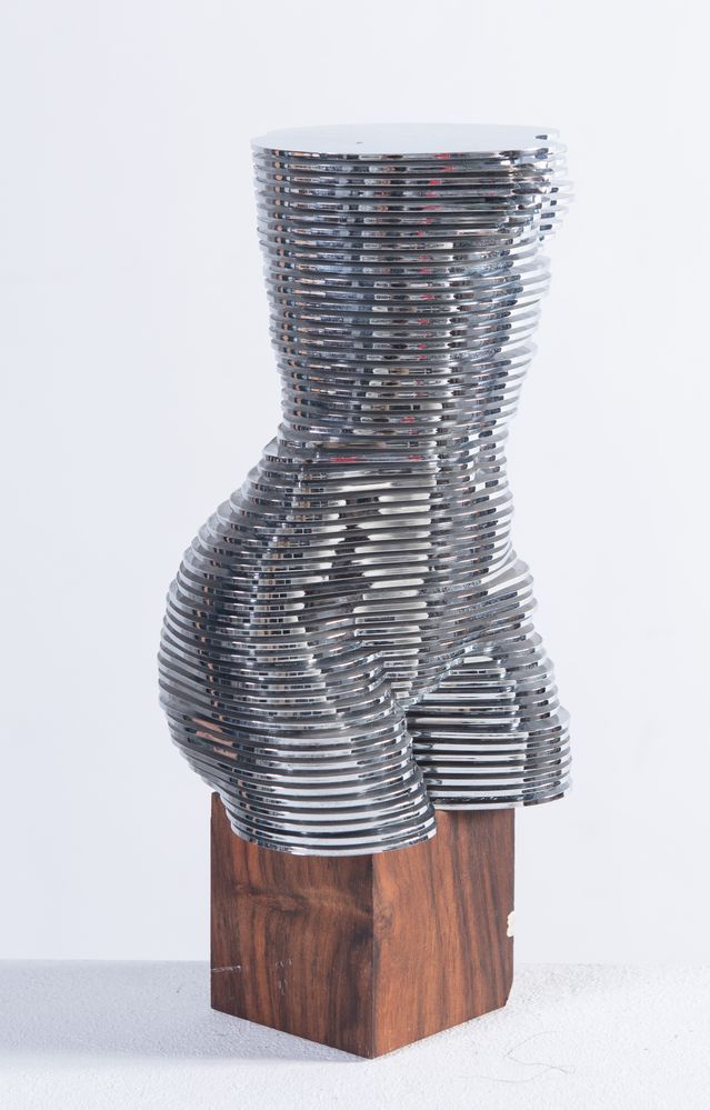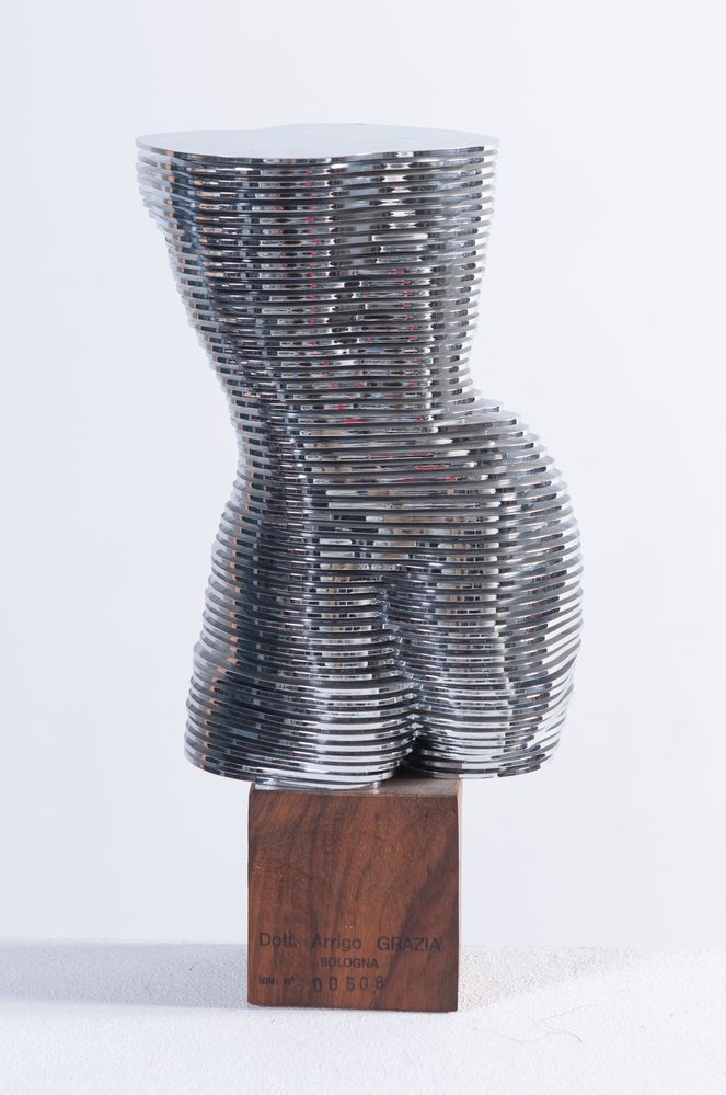 OTTO MONESTIER (Milano 1918 - Induno Olona 1997) “Eva”, 1977. Scultura dinamica di nudo di donna in plastica cromata e base in legno. Cm 25,5x13x11. Firmata sotto la base in legno Otto Monestier. Sul primo piatto opera intitolata Eva.