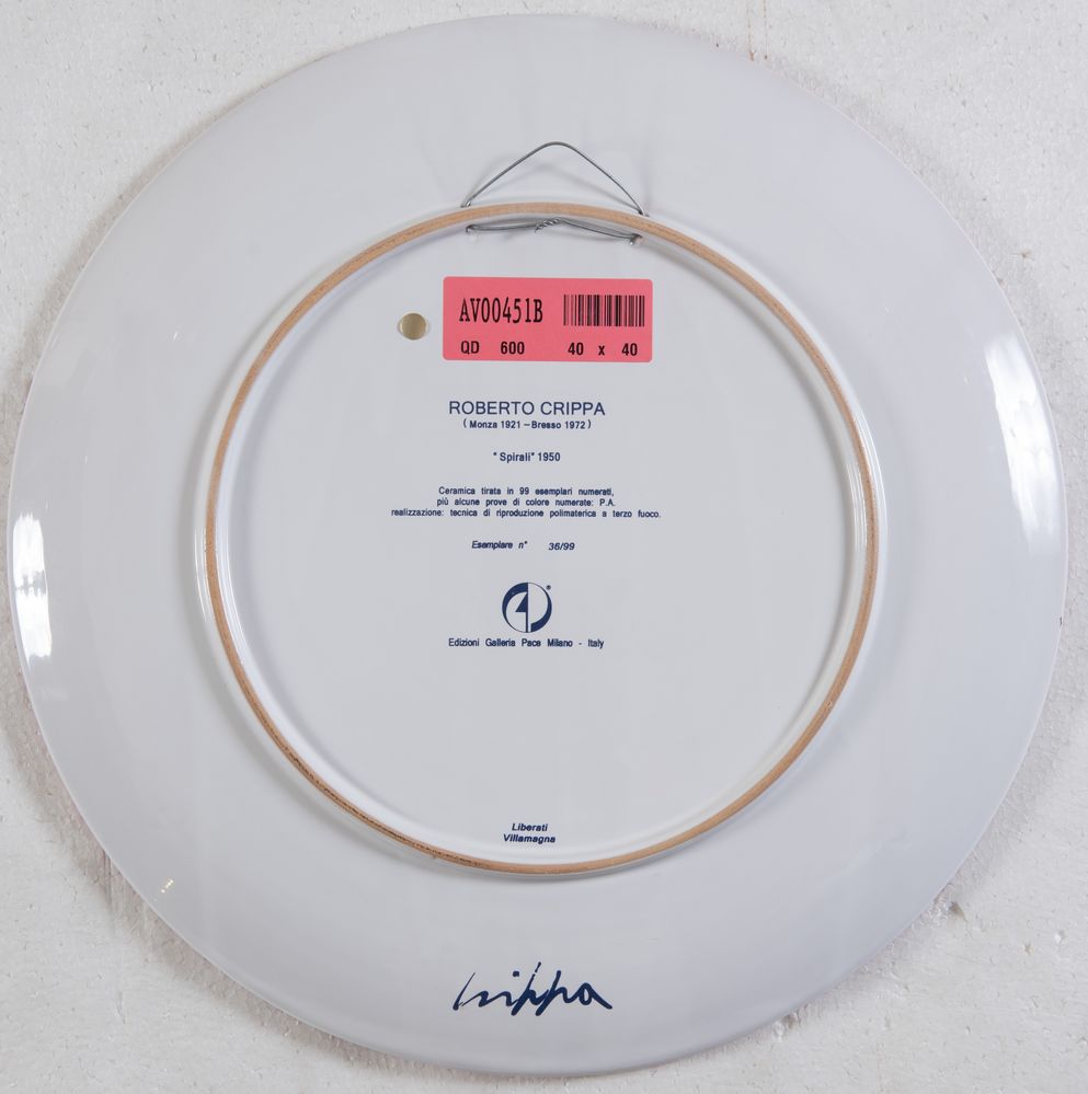 ROBERTO CRIPPA (Monza 1921 - Bresso 1972) "Spirali", 1950. Piatto in ceramica policroma. Diametro: cm 41. Al retro opera firmata Crippa. Esemplare n. 36/99. Ed. Galleria Pace, Milano.