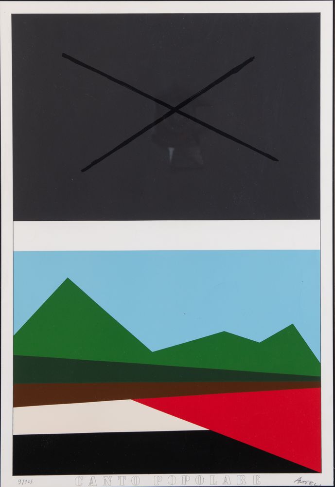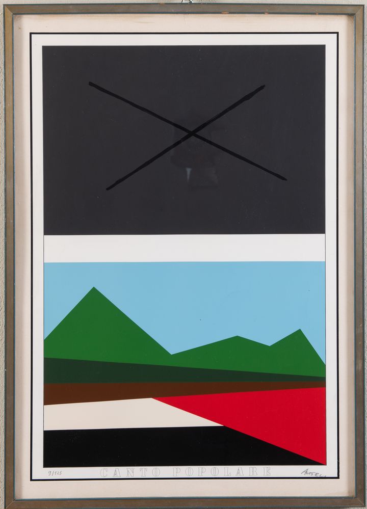 FRANCO ANGELI (Roma 1935 - Roma 1988) "Canto popolare", anni '70. Litografia a colori su carta. Foglio: cm 70x50; lastra: cm 64,5x45,6. Opera firmata in basso a destra Angeli. Reca numeri di tiratura in basso a sinistra 9/125. Opera intitolata al centro Canto popolare.