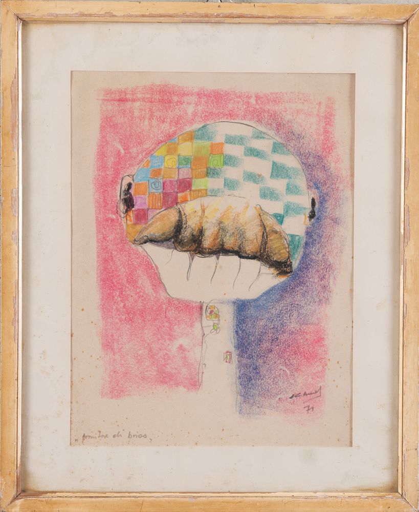 GODWIN EKHARD (1932-1995) "Fornitore di brios", 1971. Tecnica mista su carta. Cm 36x28. Opera firmata e datata in basso a destra Ekhard '71. Opera intitolata in basso a sinistra Fornitore di brios.