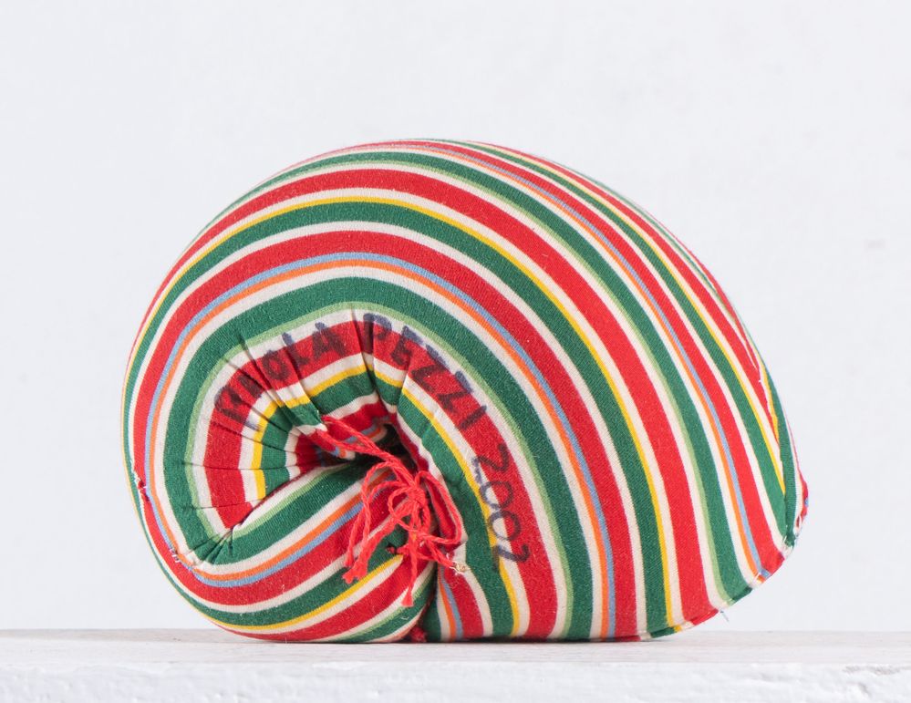 PAOLA PEZZI (Brescia 1963) “Senza titolo”, 2002. Fagottino in tessuto imbottito a righe. Cm 11x20x16. Opera firmata e datata sotto la base Paola Pezzi 2002.