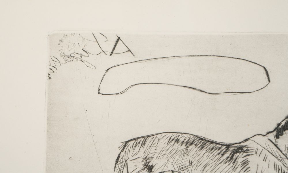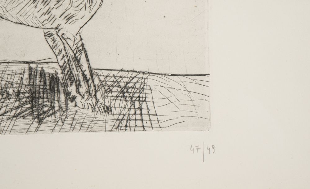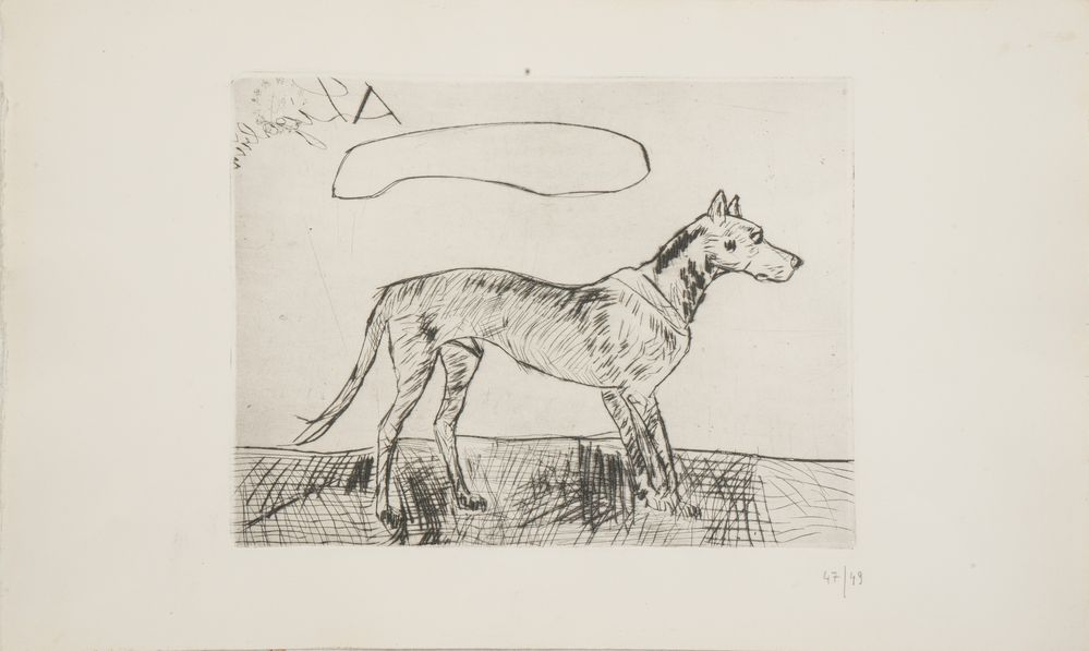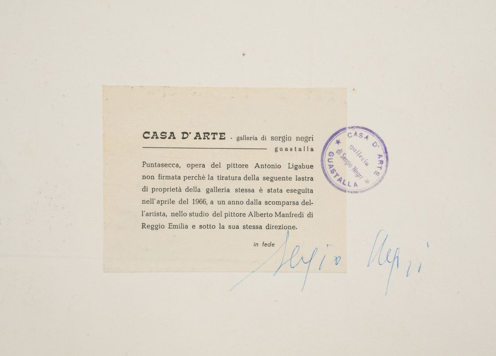 ANTONIO LIGABUE (Zurigo 1899 - Gualtieri 1965) "Cane", 1966. Puntasecca su carta. Lastra: cm 22x29,5. Foglio: cm 31x50. Reca numeri di tiratura in basso a destra 47/49. Al retro reca timbro della Casa d'Arte Galleria Sergio Negri, Guastalla. Al retro reca etichetta per autentica della Galleria Sergio Negri, Guastalla.