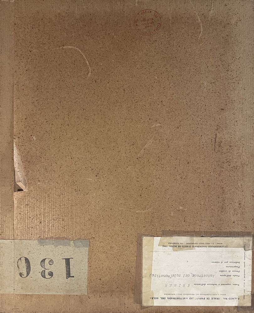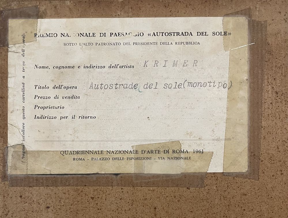 KRIMER (Perugia 1908 - Viareggio 1977) "Autostrada del Sole (monotipo)", 1961. Tecnica mista su carta. Cm 39,2x28. Opera firmata e datata in basso a destra Krimer 61. Al retro reca etichetta del premio nazionale di paesaggio "Autostrada del Sole", Quadriennale Nazionale d'Arte di Roma 1961. Esposizioni: Quadriennale Nazionale d'Arte di Roma 1961.