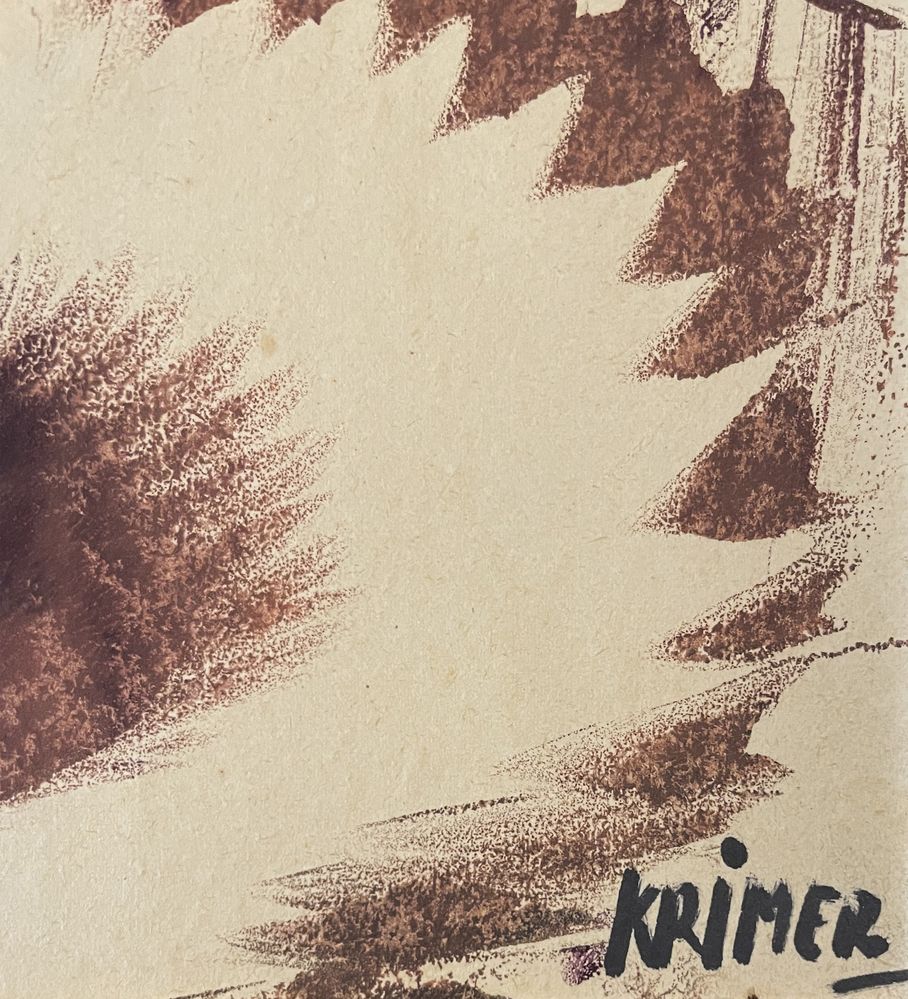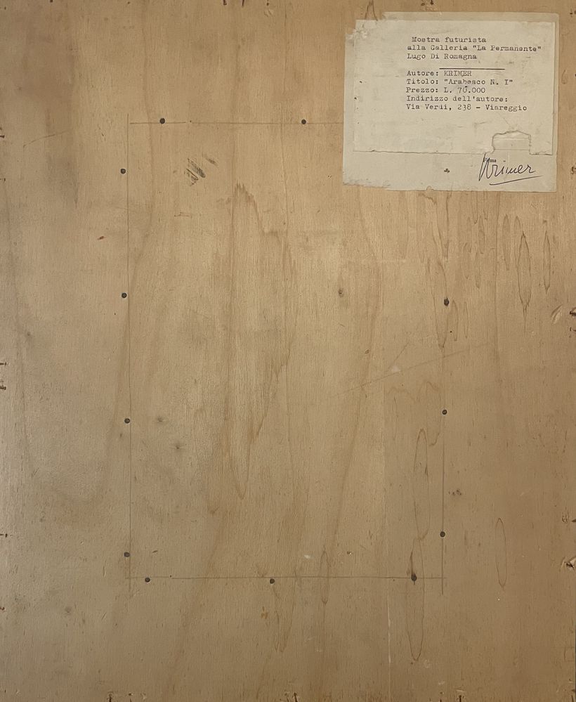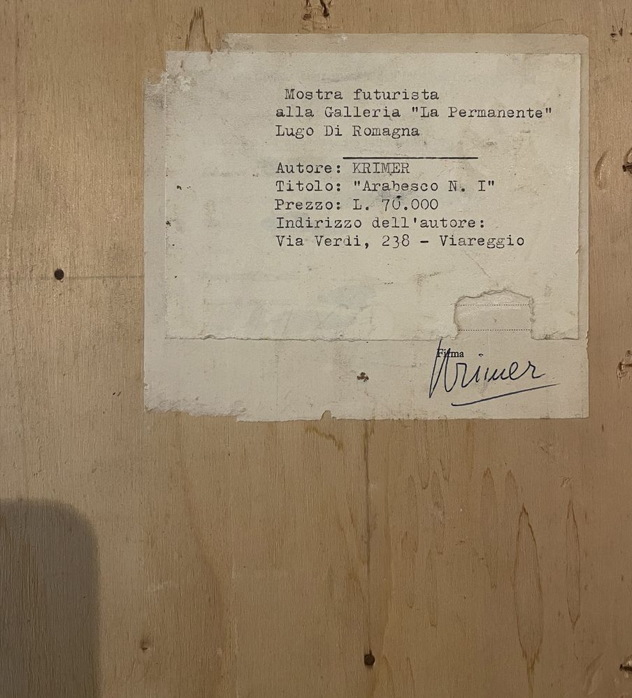 KRIMER (Perugia 1908 - Viareggio 1977) "Arabesco N. I". Tecnica mista su carta. Cm 27,3x18,3. Opera firmata in basso a destra Krimer. Al retro reca etichetta della Mostra Futurista alla Galleria La Permanente, Lugo di Romagna con firma dell'artista. Esposizioni: Mostra Futurista alla Galleria La Permanente, Lugo di Romagna