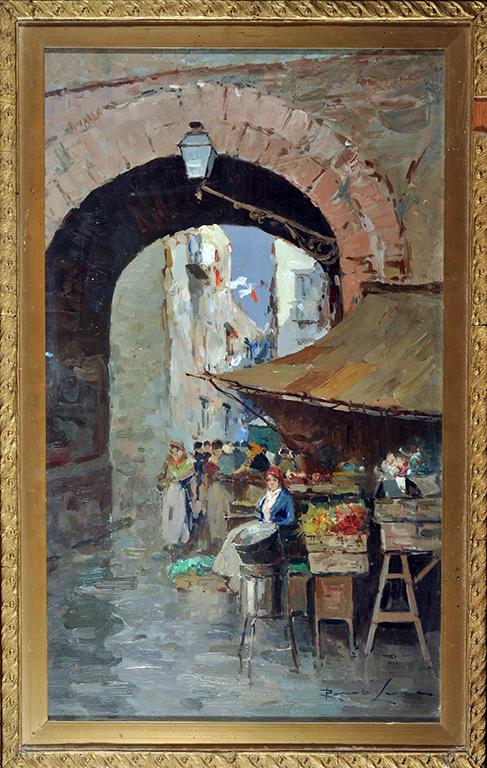 Leone Romolo (Napoli 1890 - 1964) Mercato olio su tavola, cm 54x32 firmato in basso a destra: Romolo Leone