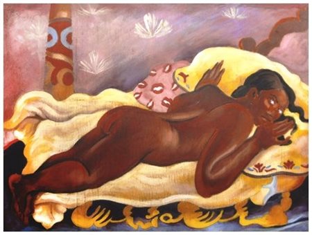 ROBERTO SGUANCI Firenze 1948 Donna tahitiana sdraiata – omaggio a Paul Gauguin 1980 Olio su cartone inciso 50 x 70. Firma in a. a s.; sul verso titolo e firma + etichetta.