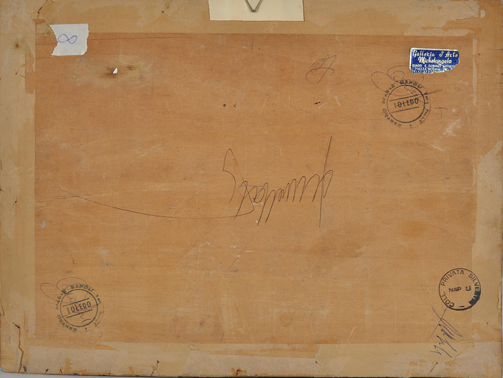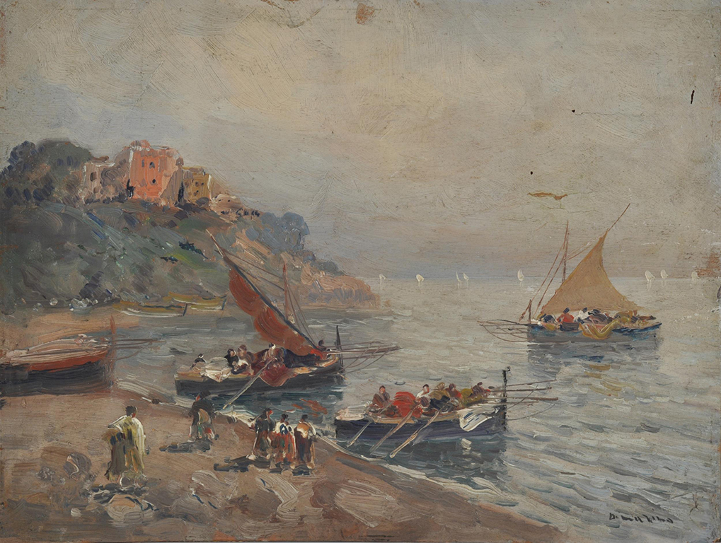 Di Marino Francesco (Napoli 1892 - 1954) Marina olio su tavola cm 30x40 firmato in basso a destra: Di Marino a tergo cartiglio Galleria d'Arte Michelangelo, Napoli; timbri Centro d'arte Toledo, Napoli