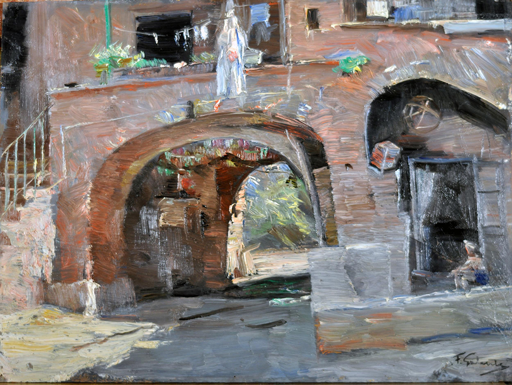 Galante Francesco (Margherita di Savoia, FG 1884 - Napoli 1972) Cortile olio su cartone, cm 30x40 firmato in basso a destra: F. Galante