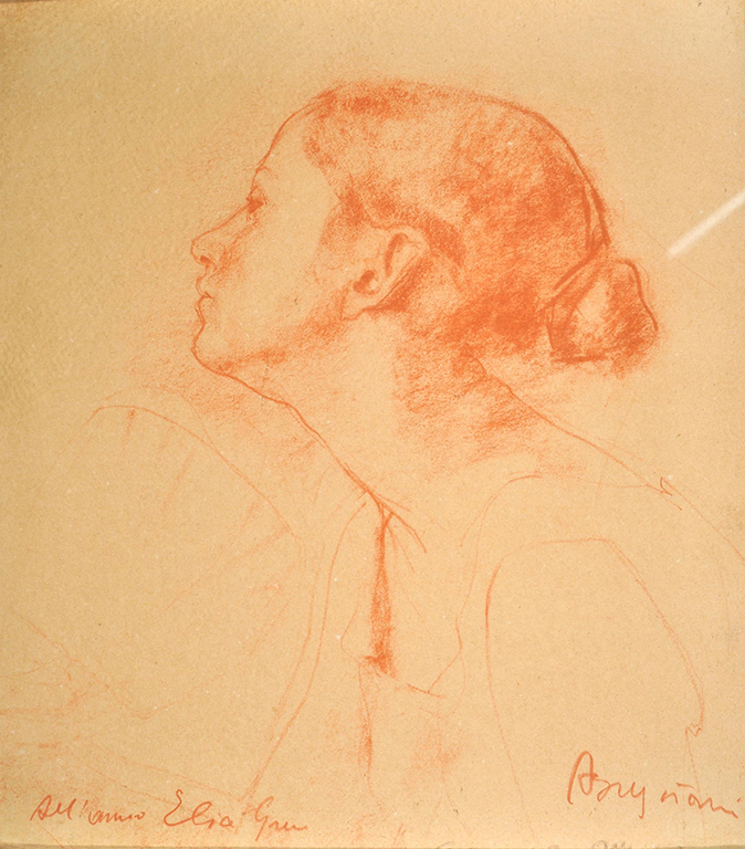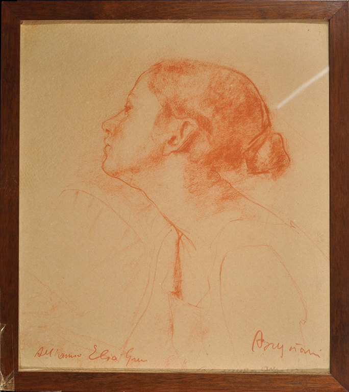 Bresciani Antonio (Napoli 1902 - 1998) Profilo femminile sanguigna su carta, cm 37x32 firmato in basso a destra: Bresciani dedicato in basso a sinistyra: al caro amico Emilio Greco