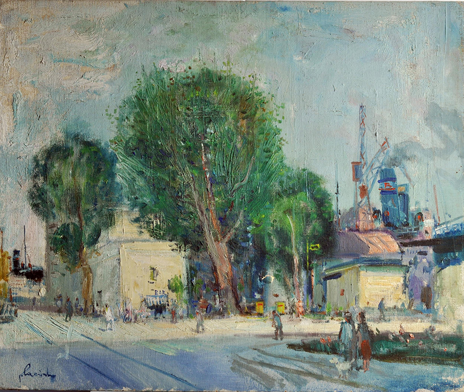Placido Errico (Napoli 1909 - 1983) Strada di città olio su cartone, cm 50x60 firmato in basso a sinistra: Placido