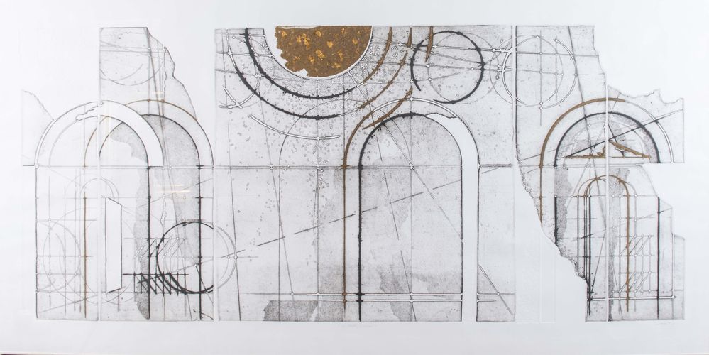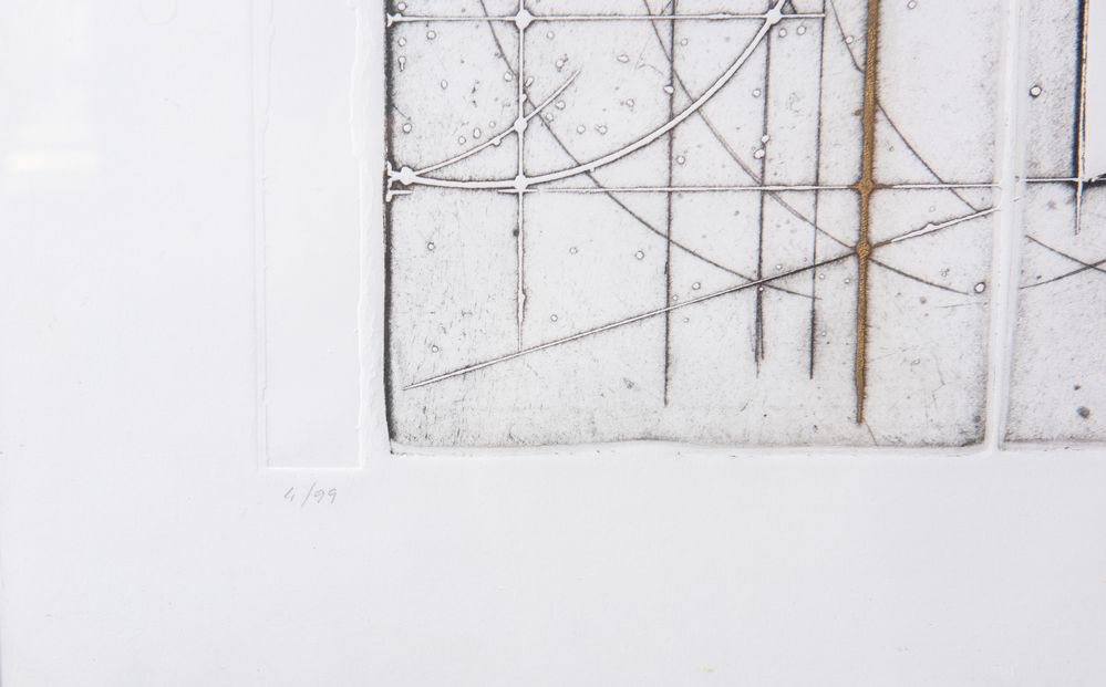 WALTER VALENTINI (Pergola 1928 - Milano 2022) "Le misure, il cielo". Litografia a colori su carta. Cm 79x180,5. Opera firmata in basso a destra Valentini. Reca numeri di tiratura in basso a sinistra 4/99.