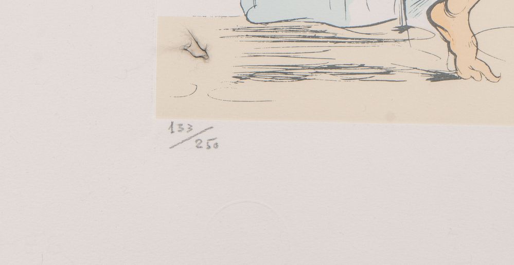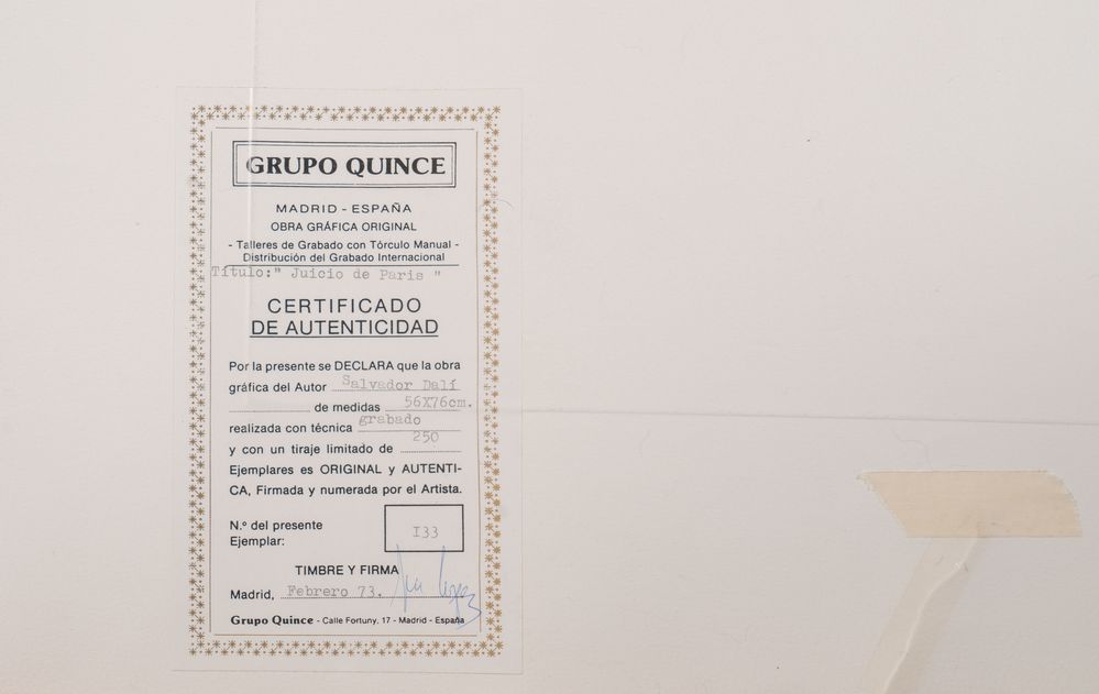 SALVADOR DALÍ (Figueres 1904 - 1989) "The Judgement of Paris". Incisione a colori su carta. Foglio: cm 55,5x75; lastra: cm 46,5x51.5. Opera firmata in basso a destra Dalì. Reca numeri di tiratura in basso a sinistra 133/250. Reca timbro in basso a sinistra Gravure Authentique S. Dalì. Reca timbro in basso a destra. Al retro reca certificato di autenticità del Grupo Quince, Madrid. (difetti)