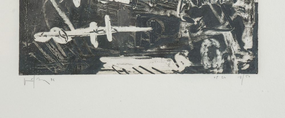 EMILIO VEDOVA (Venezia 1919 - 2006) "Op. 24", 1974. Incisione su carta. Lastra: cm 11x16,5; foglio: cm 50x35. Opera firmata e datata in basso a sinistra Vedova '74. Opera intitolata in basso a destra Op. 24. Reca numeri di tiratura in basso a destra 18/50.