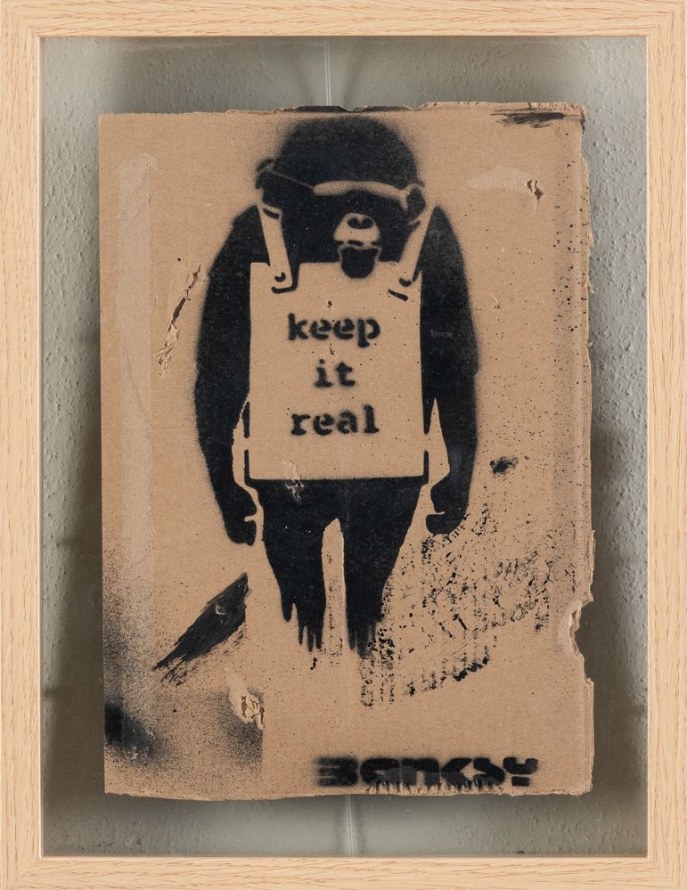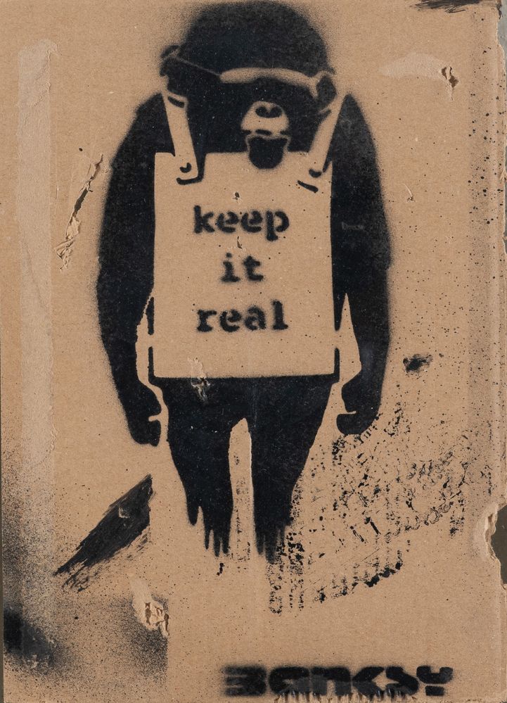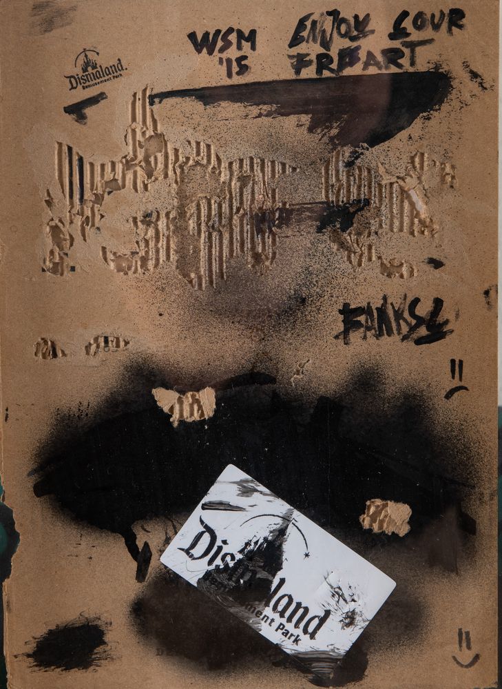 BANKSY (Bristol 1974) "Dismaland", 2015. Spray su cartone. Cm 32x23. Opera firmata al retro Banksy. Al retro reca timbro Dismaland. Opera accompagnata da ticket d'ingresso a Dismaland e una brochure pieghevole di Dismaland.
