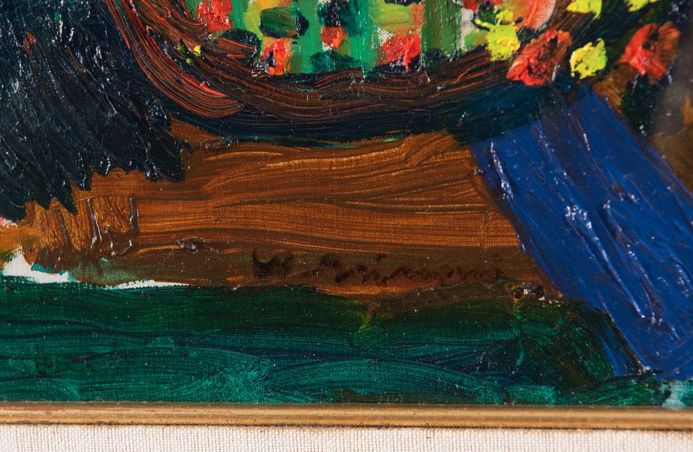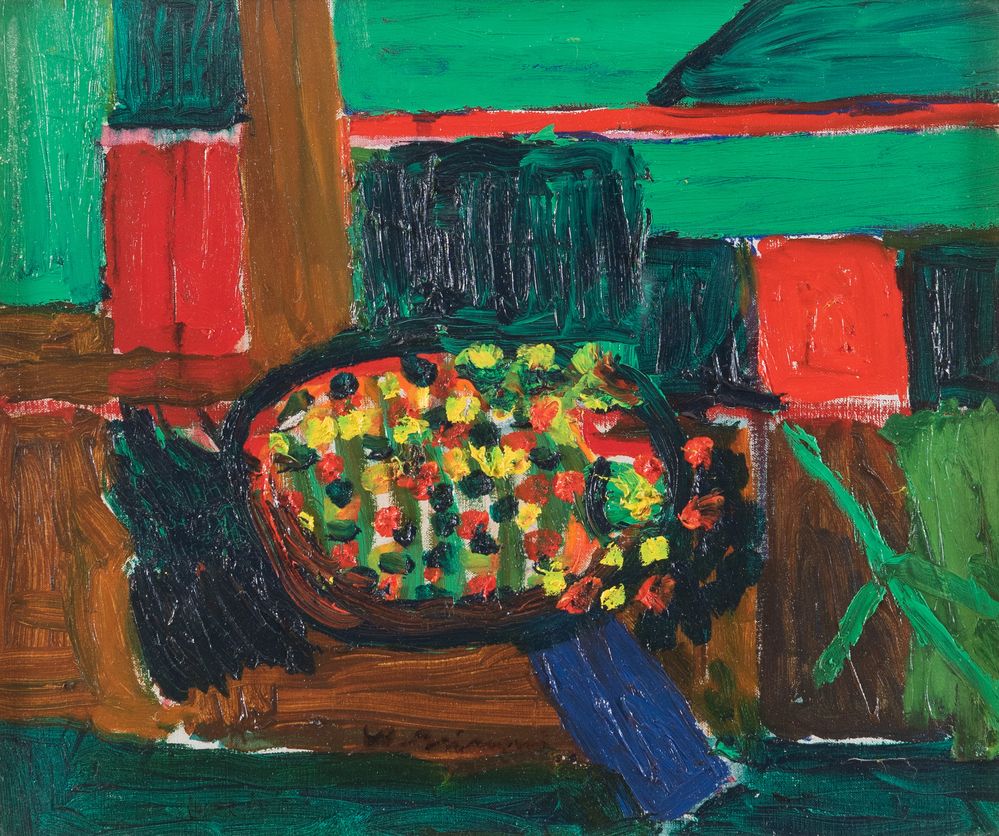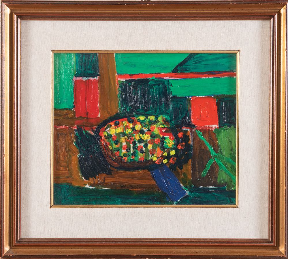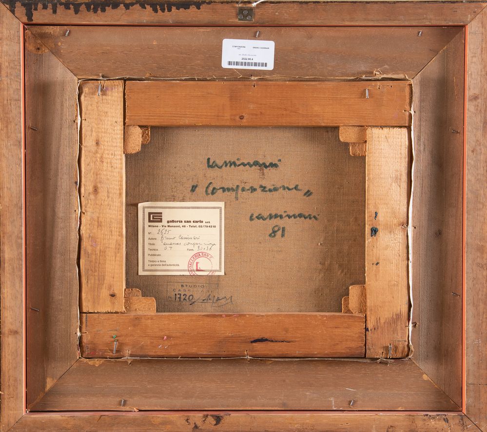 BRUNO CASSINARI (Piacenza 1912 - Milano 1992) "Composizione", 1981. Olio su tela. Cm 30x36. Opera firmata in basso al centro Cassinari. Al retro opera firmata, intitolata e datata Cassinari, Composizione, 81. Al retro reca timbro dello Studio Cassinari con il numero 1720. Al retro reca etichetta e timbro della Galleria San Carlo, Milano. Opera accompagnata da autentica su fotografia della Galleria Pace, Milano.