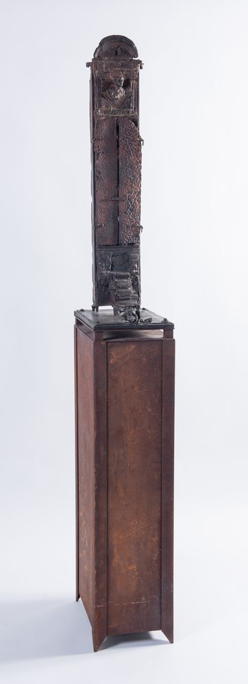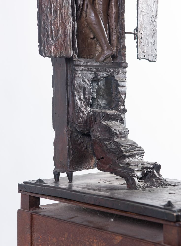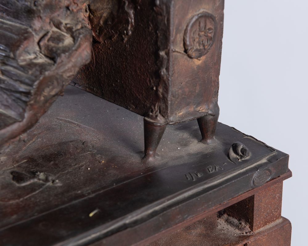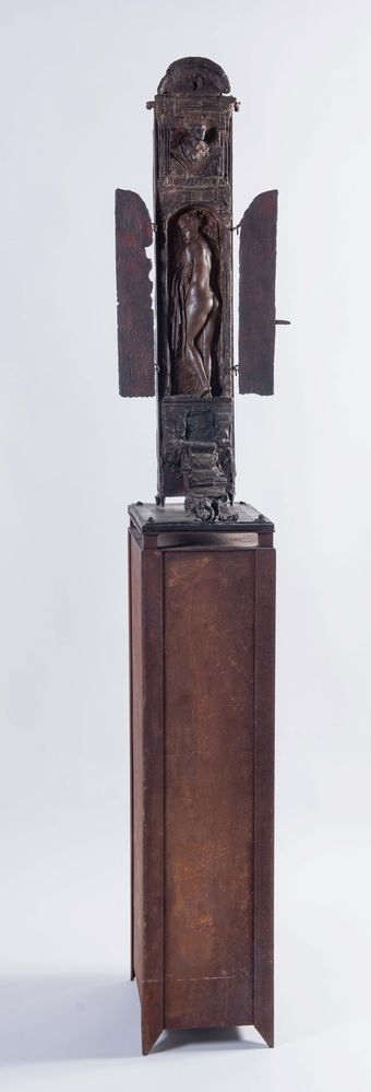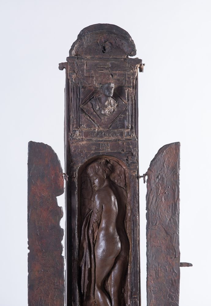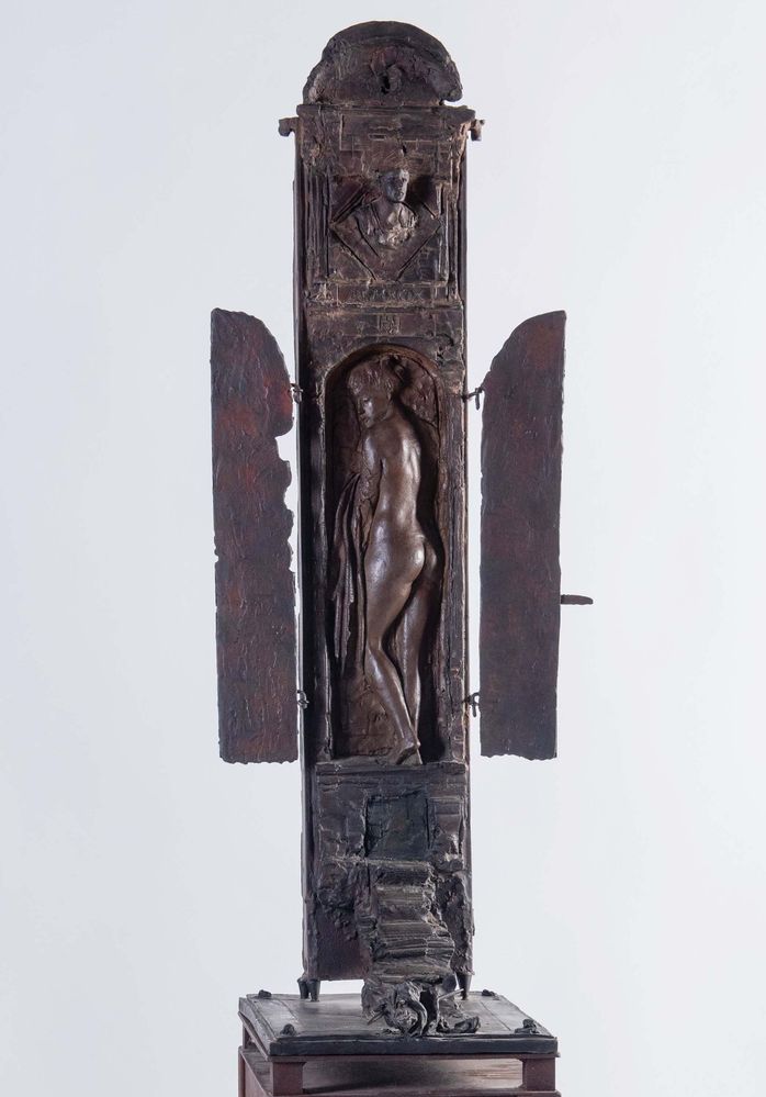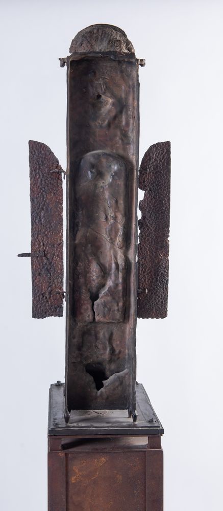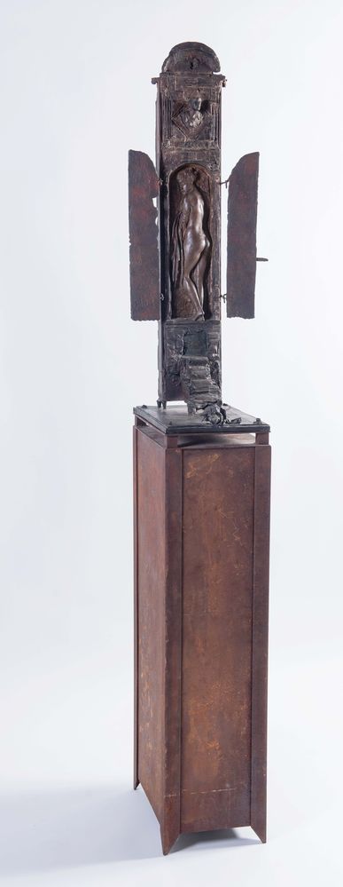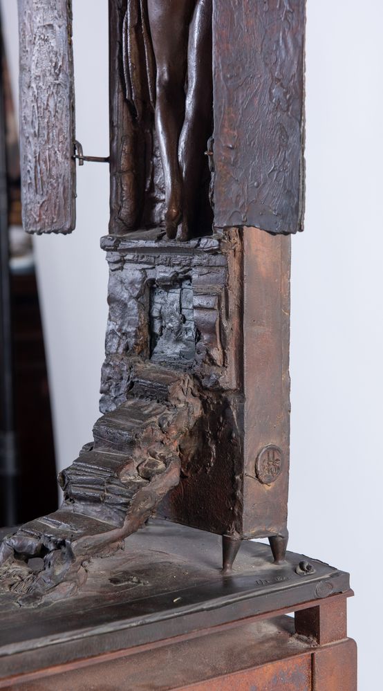 UGO RIVA (Bergamo 1951) "Vanitas", 1999. Scultura in bronzo a fusione a cera persa. Chiusa: cm 92x26x38; aperta: cm 92x35,5x38. A lato reca marchio a fuoco dell'artista. Opera datata in alto MCMXCIX. Alla base reca numeri di tiratura 1/6 P.A. Reca due marchi a fuoco della Venturi Arte Cera Persa, Bologna. Opera poggiante su basamento in acciaio Corten (altezza totale: cm 193,5). Opera accompagnata da autentica su catalogo a firma dell'artista. Esposizioni: Ugo Riva. "Il Viaggio". Palazzo dei Notai, Bologna, 2000. Bibliografia: Catalogo della mostra Ugo Riva. "Il Viaggio". Palazzo dei Notai, Bologna, 2000, pag. 33.