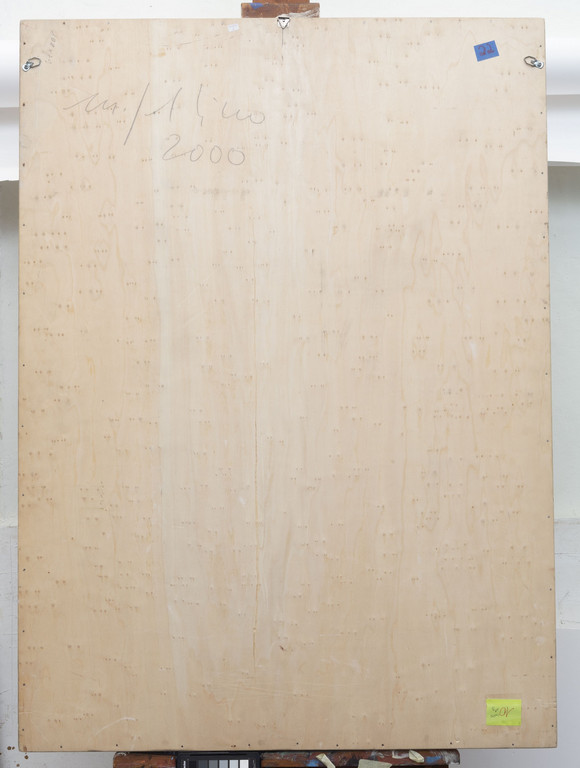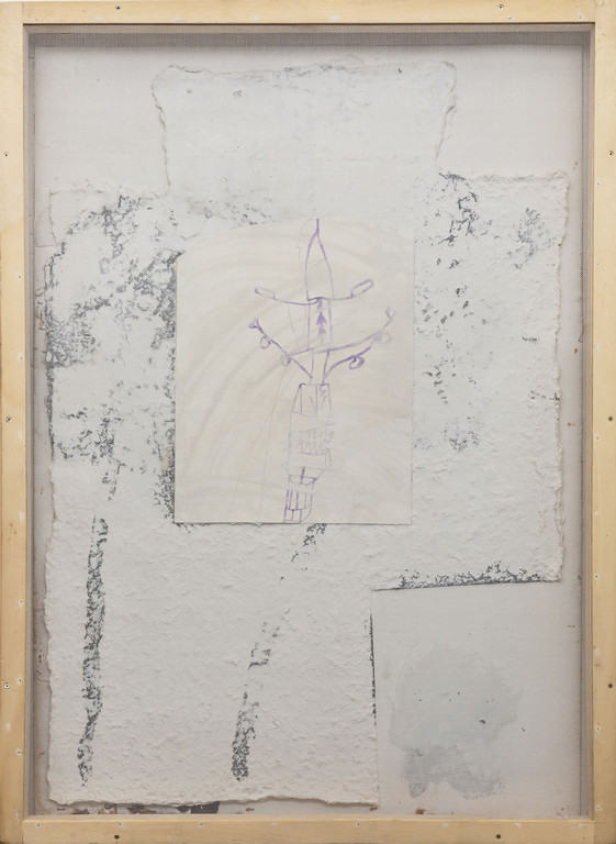collage e tecnica mista su carta applicata su tavola in box di legno con rete metallica cm 102 5x72 5