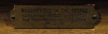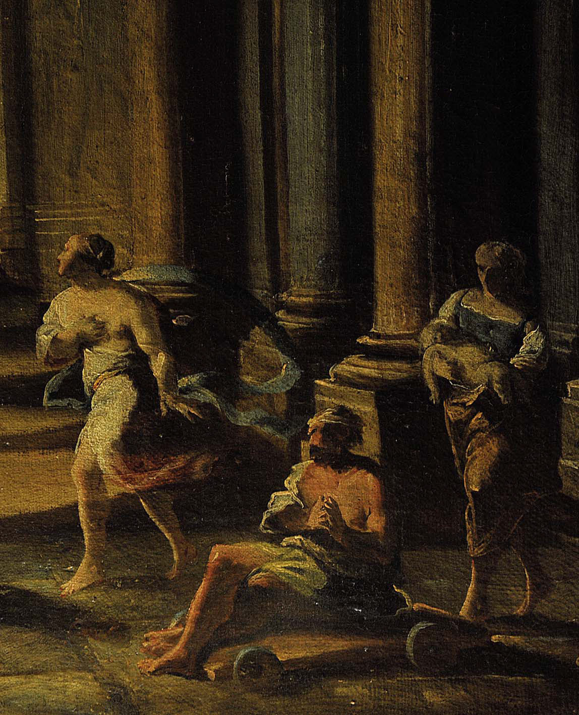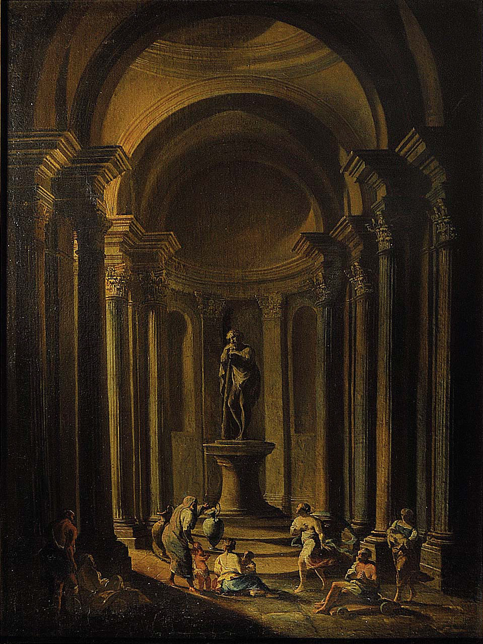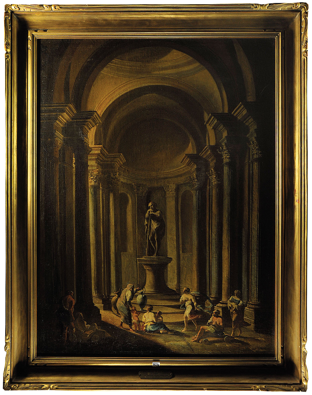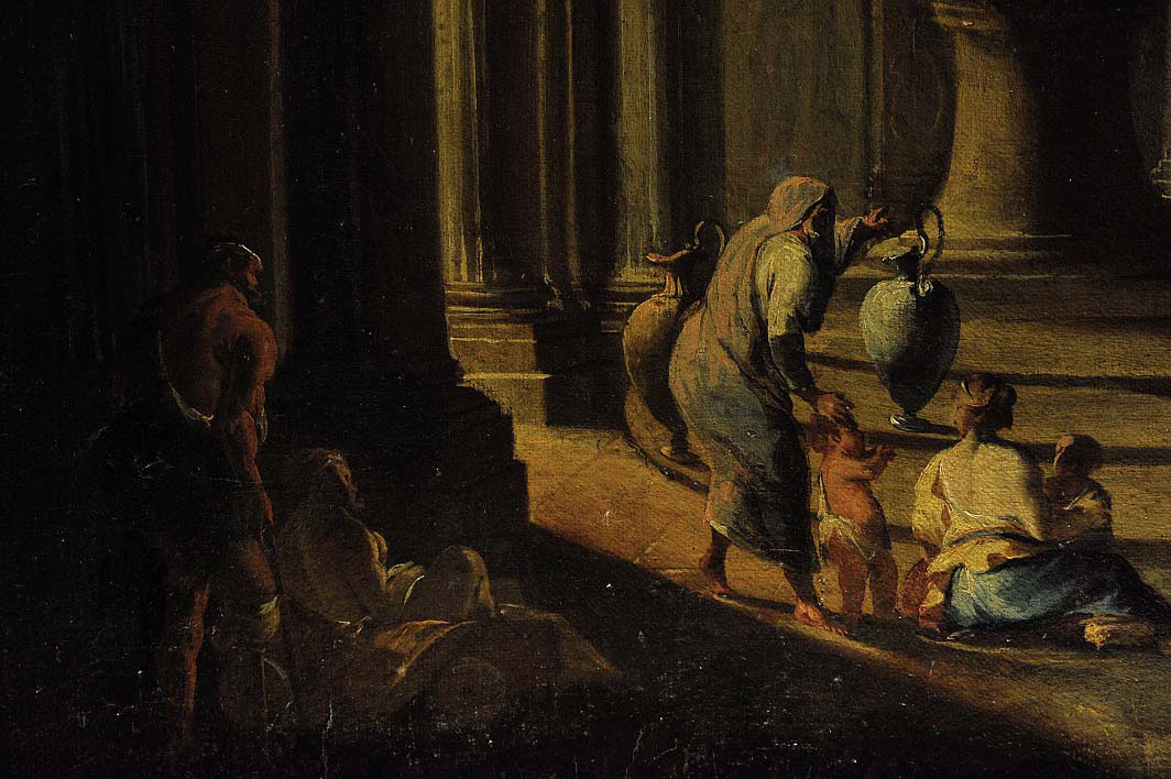 SEBASTIANO RICCI (1659 - 1734). CERCHIA DI Interno architettonico Olio su tela, 99,5x74,5 Provenienza: Colonnello Frank W. Chesrow, Chicago (targa in metallo) Semenzato, Venezia, 22.11.1998, l. 804 (€ 56.746)* Esposizioni: Illinois State Museum, Springfield The Frank W. Chesrow Collection of Italian and Western European Renaissance and Baroque Paintings (data non nota) Elementi distintivi Una targa con attribuzione a Sebastiano Ricci Stato di conservazione Segno: 70% (superficie pittorica secca; numerose cadute; alcune integrazioni sulla architettura e sulle figure, per esempio cfr. il primo mendico a sinistra) Supporto: 70% (telaio sostituito, rintelo)