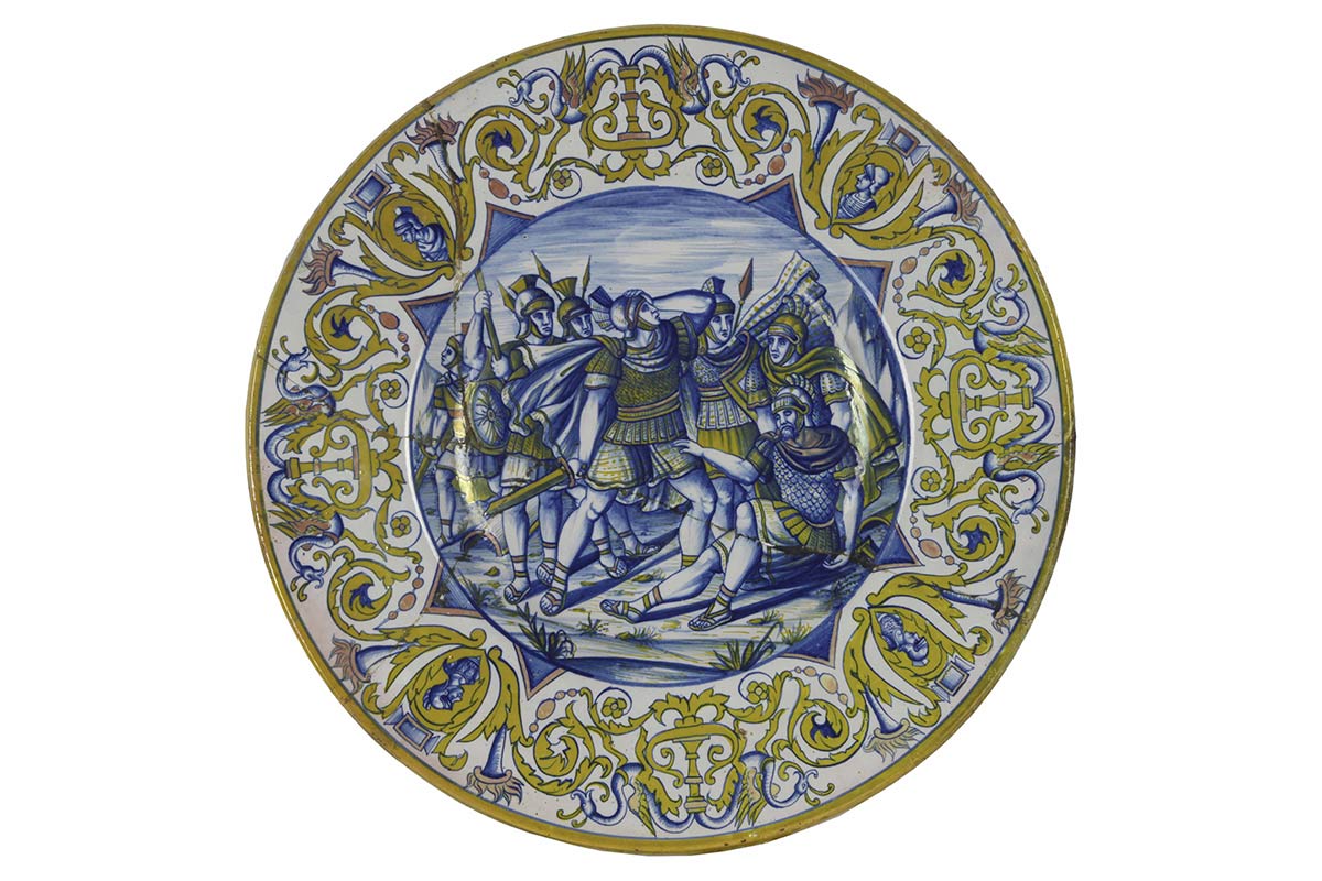 Grande piatto a larga tesa ed ampio cavetto. Maiolica dipinta in policromia con in tesa bellissima fascia decorata con busti fra ghirigori e nel cavetto Battaglia con soldato ferito a terra, Ø cm. 41; h. cm. 6.