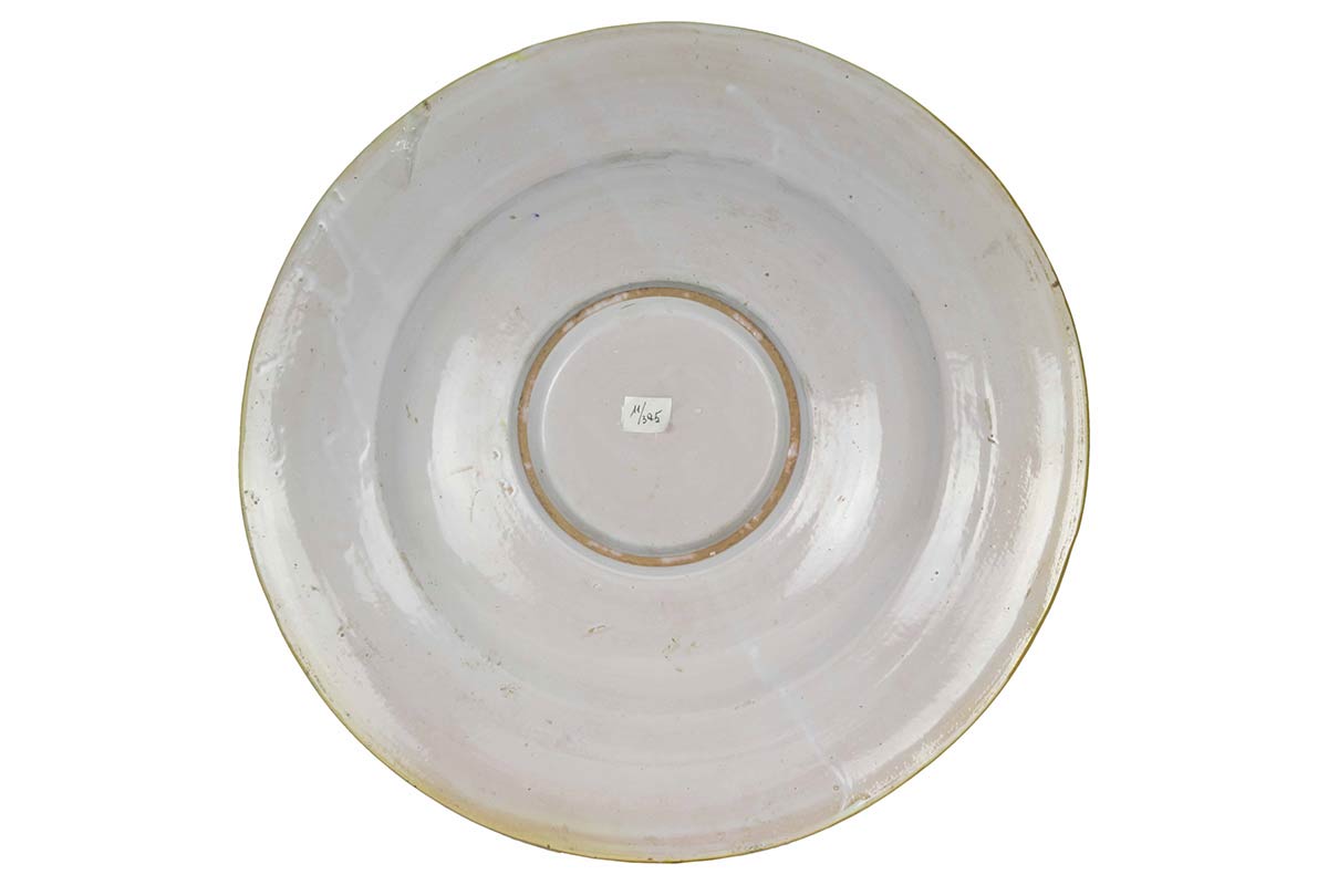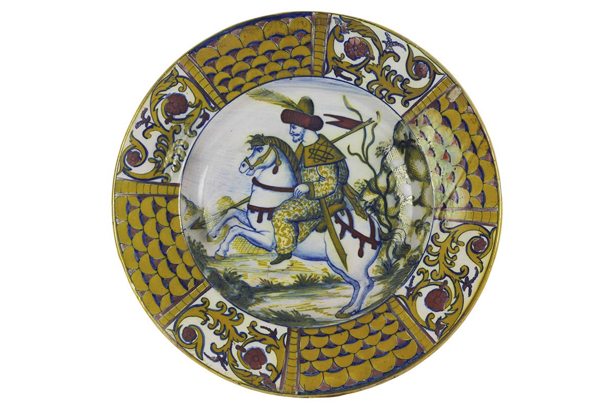 Grande piatto in maiolica policroma in tipologia moresca a riflessi dorati e rossi con larga tesa divisa in otto settori alternati fra cinque linee puntute parallele e leggiadri decori spiraliformi; nell’ampio centro “Cavaliere arabo in corsa entro paesaggio”, Ø cm. 37; h. cm. 5