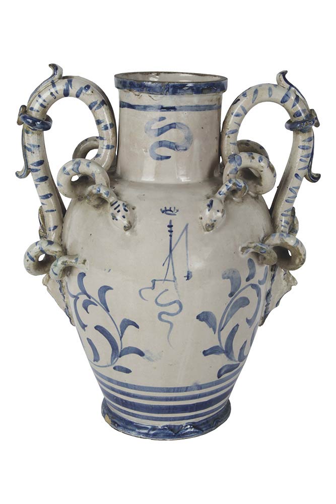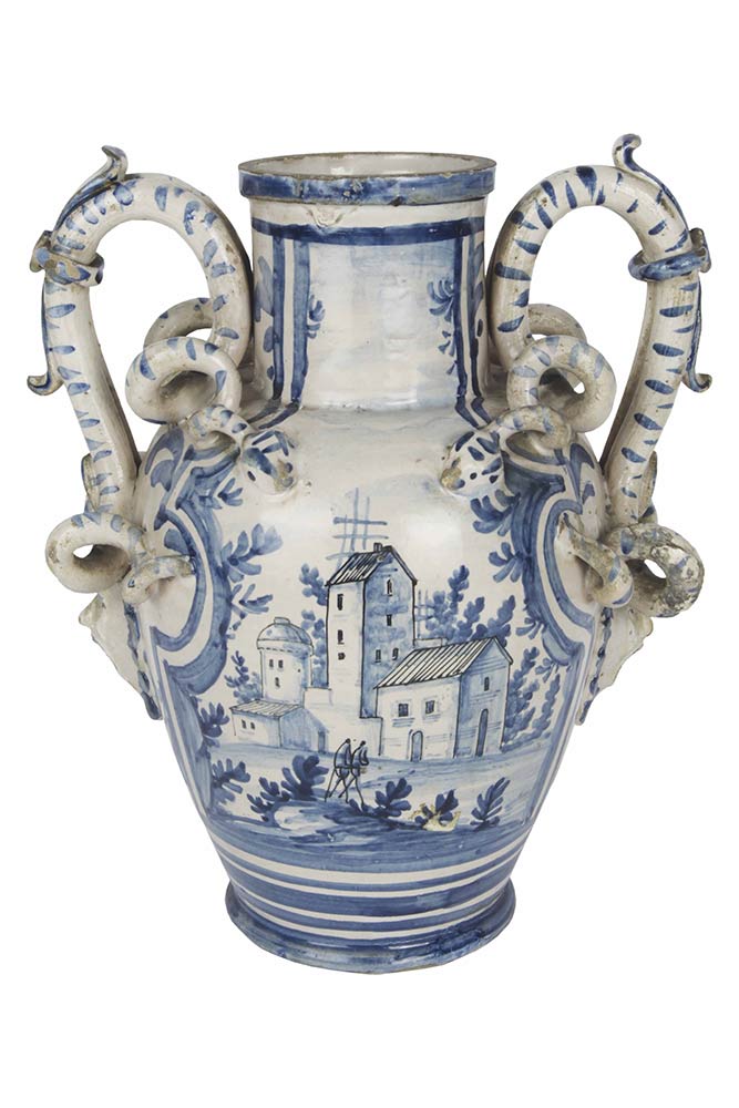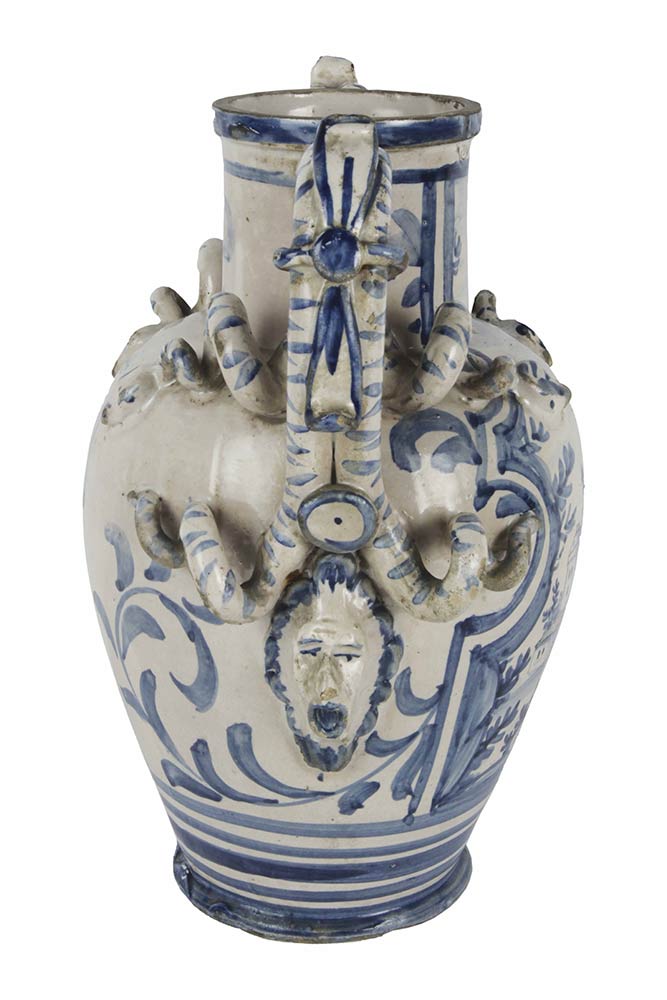 Brocca in maiolica ad alto collo cilindrico con manici complessi appoggiati al collo e ripiegati con mascheroni verso il centro pancia ovoide; dipinta in blu su bianco di maiolica con rameggi e Stemma della Lanterna, dal 1641 di Albissola poi fra Seicento e Settecento di Savona fino al 1786, H. cm. 27,5