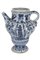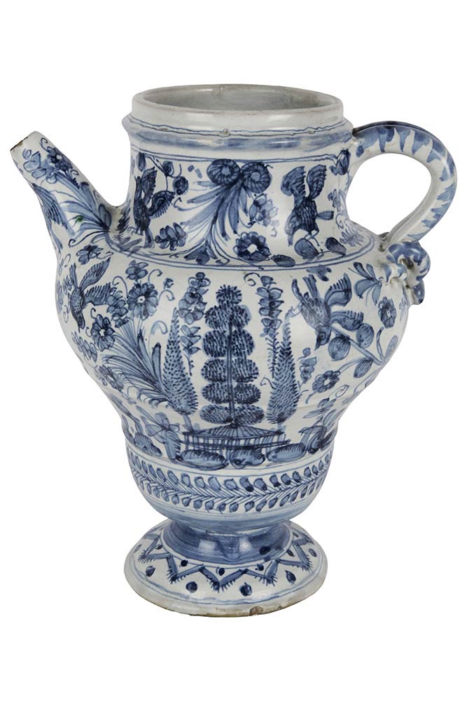 Brocca in maiolica ad alto collo cilindrico con manico che da collo appoggia ad inizio pancia ben segnato e all’opposto, cannello versatore verso l’alto; presenta forte rastremazione nella parte inferiore con registro a doppia fascia a segnetti sotto un decoro avvolgente in blu su bianco di maiolica con rameggi, fiori, animali vari in stile calligrafico.