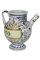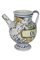 8- Brocca da farmacia in maiolica a smalto molto brillante e bello, con manico a nastro e all’opposto cannello versatore verso l’alto; al centro pancia ampio cartiglio con la scritta Ol[io].DI LAURIN S(?) fra fogliami e varie parti di portali di palazzi o di città. L’olio di laurino si ottiene con le bacche di alloro pestate e macerate per circa un mese in olio extravergine d’oliva ed è utile per lenire raffreddore, reumatismi, distorsioni, slogature, malattie della pelle, psoriasi, etc, H. cm. 20