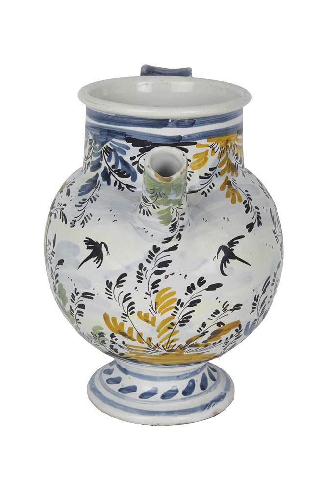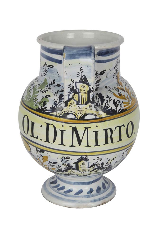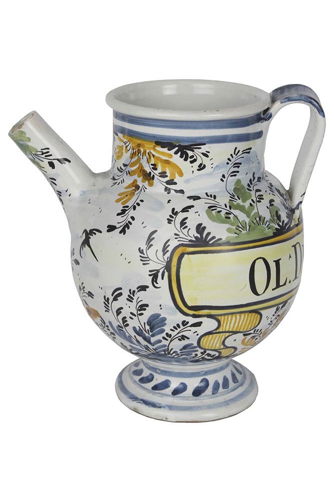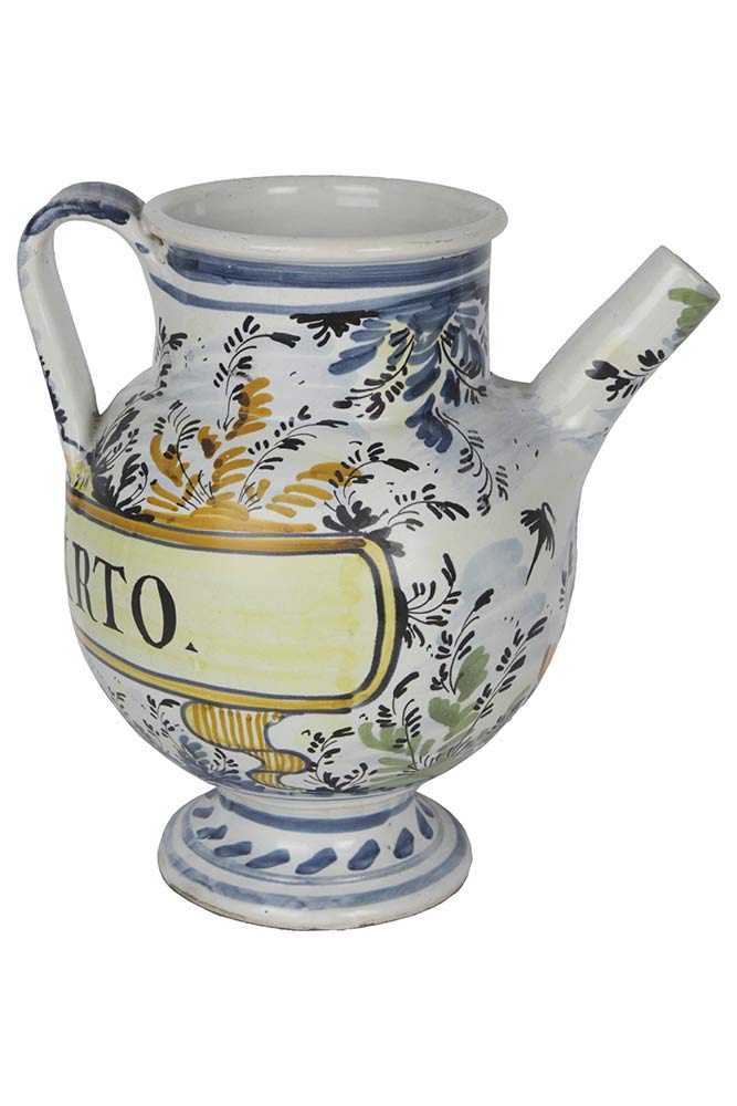 8- Brocca da farmacia in maiolica a smalto molto brillante e bello, con manico a nastro e all’opposto cannello versatore verso l’alto; al centro pancia ampio cartiglio con la scritta Ol[io].DI LAURIN S(?) fra fogliami e varie parti di portali di palazzi o di città. L’olio di laurino si ottiene con le bacche di alloro pestate e macerate per circa un mese in olio extravergine d’oliva ed è utile per lenire raffreddore, reumatismi, distorsioni, slogature, malattie della pelle, psoriasi, etc, H. cm. 20