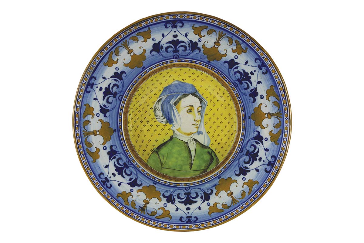 Grande piatto in maiolica policroma, in forma detta “a cappello di prete” con tesa rotondeggiante decorata in sei segmenti a fioretti e al centro fra tappeto in giallo puntinato campisce in policromia Busto di giovine con berretta. Nel verso la scritta “Pesaro / m” e sopra una S (timbro impresso), Ø cm. 34.