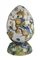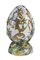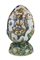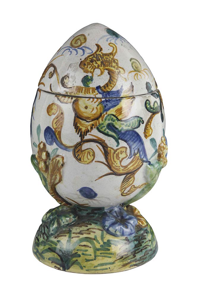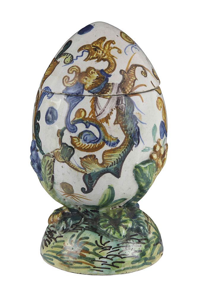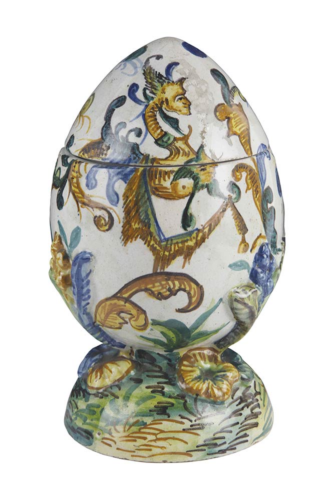 Porta bonbon oviforme con coperchio, in maiolica dipinta in policromia con parti in rilievo e decori a tarda grottesca, H. cm. 22