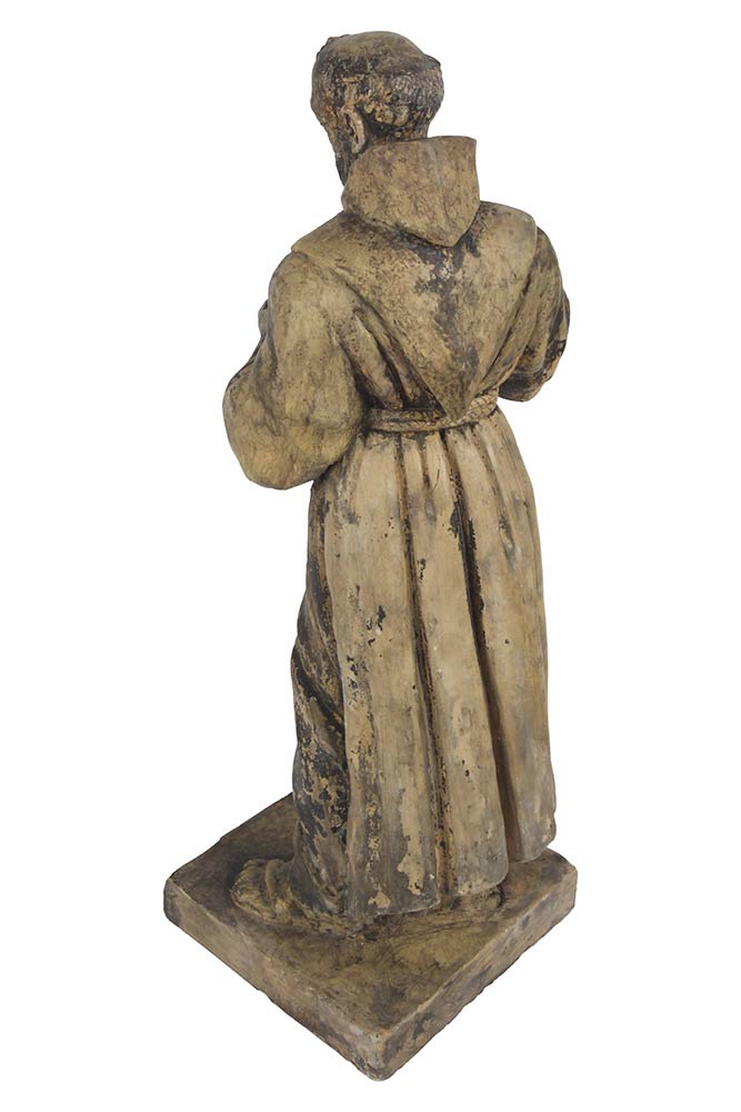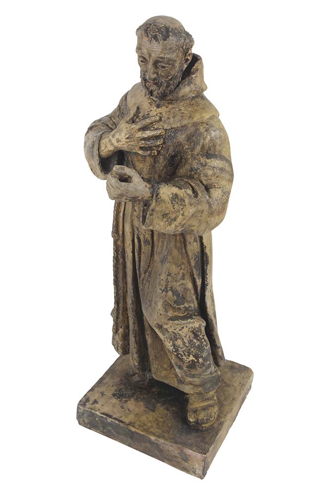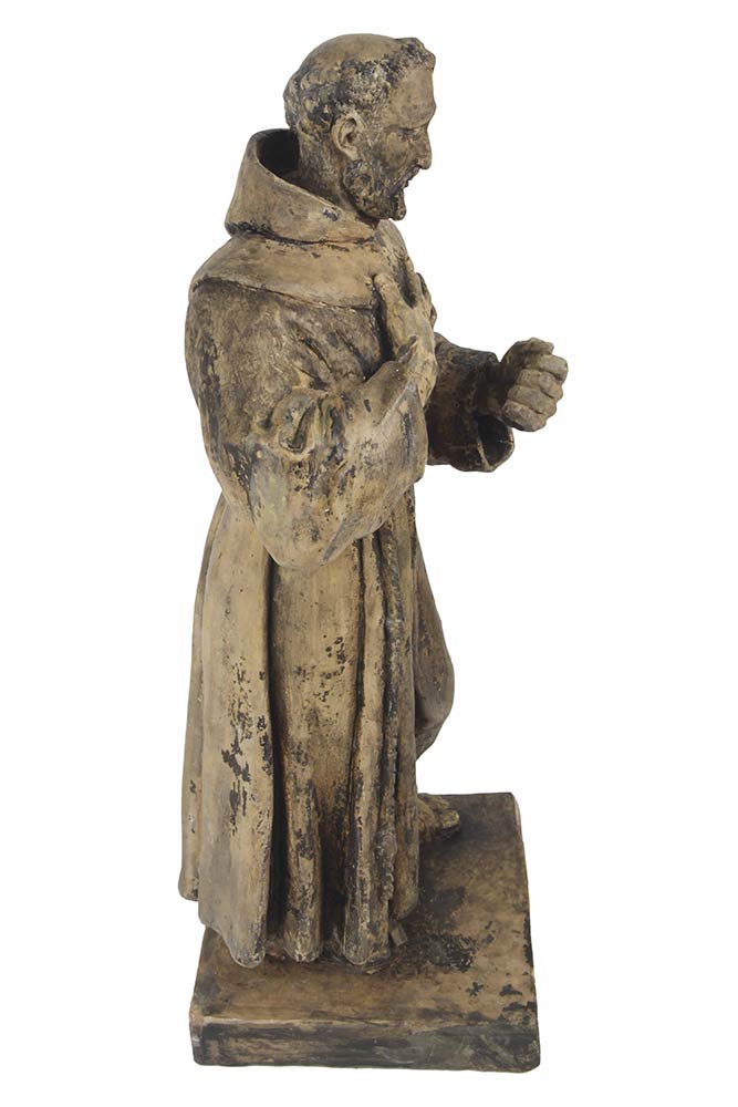 Statua di francescano in terracotta su piedistallo a parallelepipedo; ha una mano sul cuore e con l’altra tiene il Crocifisso. Si evidenziano solo tracce di pittura forse in tarda aggiunta., H. cm.42