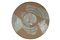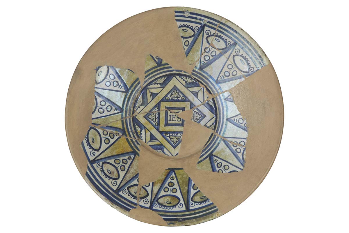 Piatto in maiolica dipinto in bianco, blu e dorature con tesa a denti di lupo e al centro entro quadrato la scritta “ IÊS” (IESUS), Ø cm. 22