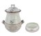 A-Grande vaso che si allarga da bocca ai manici in forma di canna di bambù, uniti alla parte sottostante a fascia diritta; ampia bocca estroflessa su cui appoggia coperchio a campana con presa a canna di bambù. Maiolica a superficie bianca suddipinta nel corpo in tenui colori, da un lato con mazzetto di campanelle e nell’altro di margherite. Nella parte inferiore ampia fascia con serie di raggere solari in rilievo; al di sotto appare dipinto il gambo delle campanelle. Nel coperchio mazzetto fiorito. Nel complesso forma e decori assai rari, H. cm. 33