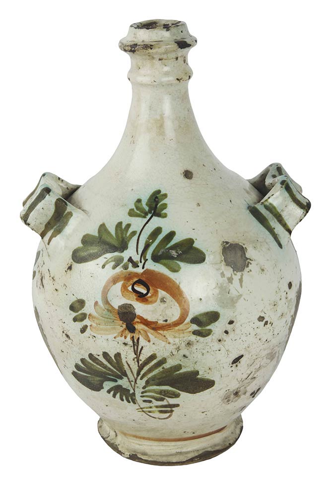 Fiasca da pellegrino in forma tondeggiante con manici atti per inserimento cordicelle, stretto collo con bocca a doppia fascia, in maiolica dipinta in policromia, da un lato con ramo di rosa e sotto i manici forse sigla di bottega (?). Veniva chiusa con tappo di sughero, H. cm. 27