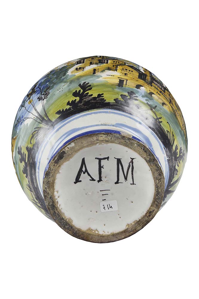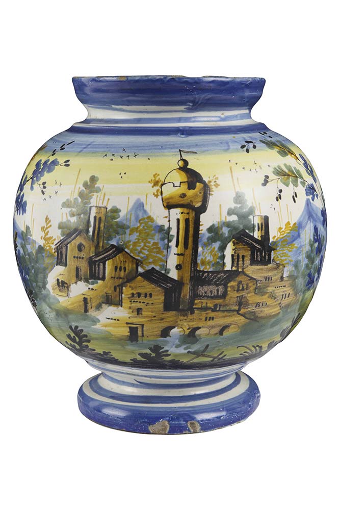 Vaso sferico con ampia bocca e appoggio più stretto, in maiolica dipinta in policromia con bellissimo paesaggio urbano con torri, caseggiati, giardini e ponticello (di Fossombrone ?).