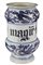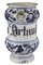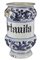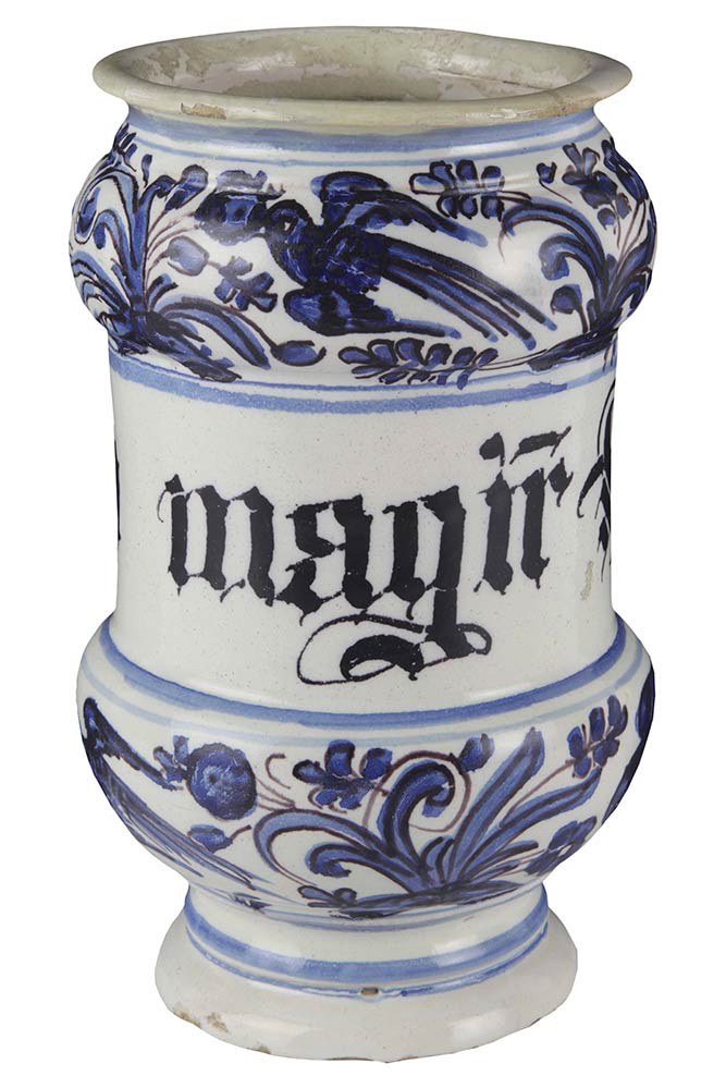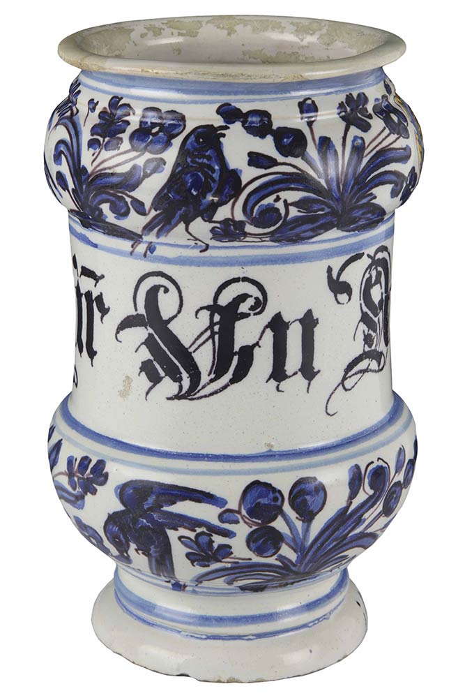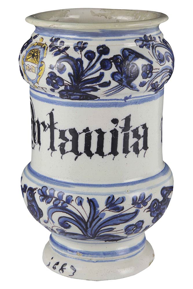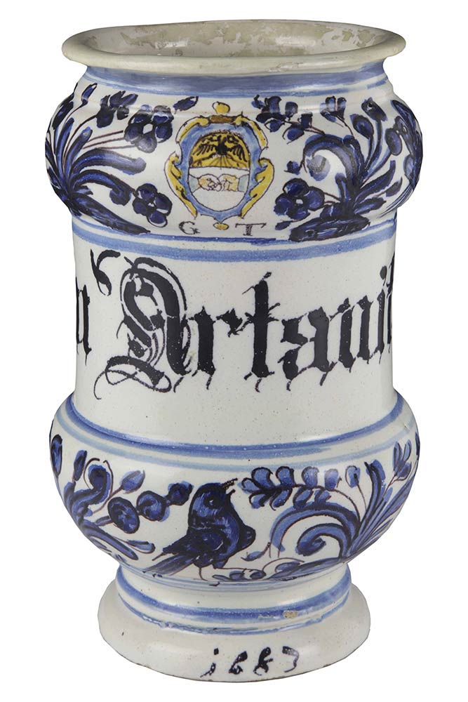 Diviso in tre parti da ampio registro centrale con scritta gotica, in ricca maiolica bianca suddipinta in blu molto acceso che ricorda la zaffera in rilievo; in alto scudetto araldico accartocciato in giallo oro e blu: stemma con le mani che si toccano, sormontate da aquila, in riferimento ad un matrimonio nobiliare e in basso le lettere G..T ; al di fuori in alto fascia con uccellini fra rameggi, sotto la scritta farmaceutica “ARTANITA”, un unguento ottenuto da ciclamino europeo. Al di sotto fascia con uccellini fra rameggi. In basso, ampio appoggio con davanti la data: i683 (1683), H. cm. 20,5