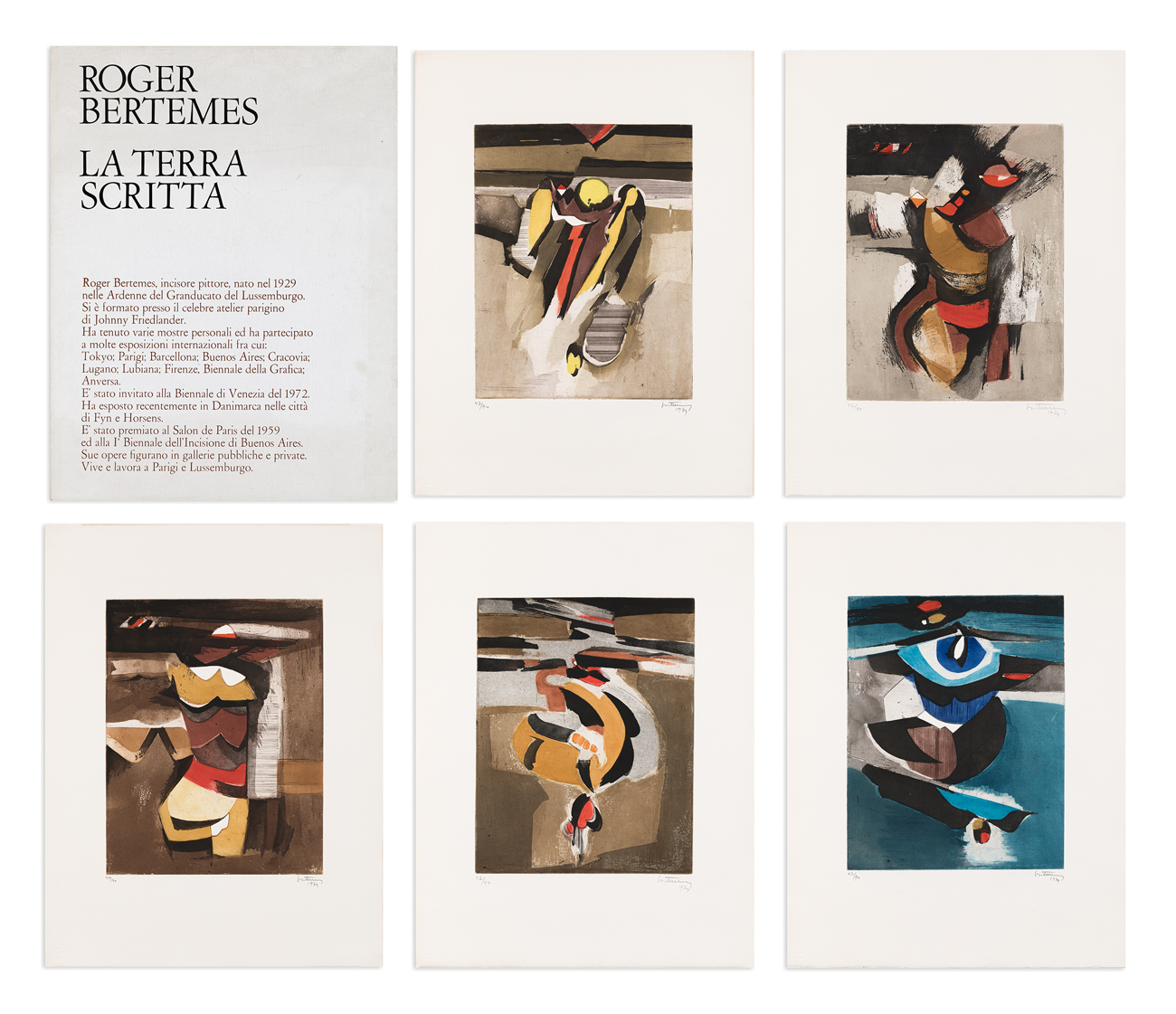 Cartella contenete 5 incisioni a colori di Roger Bertemes su carta Arches