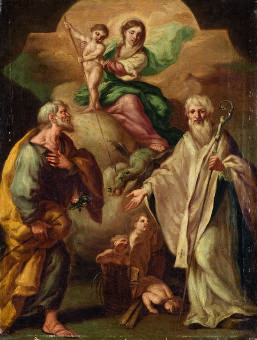 Nicola Vaccaro Napoli 1640 – 1709 MADONNA DEL CARMINE TRA SAN GIUSEPPE E SAN NICOLA DI BARI olio su tela, cm 47x35