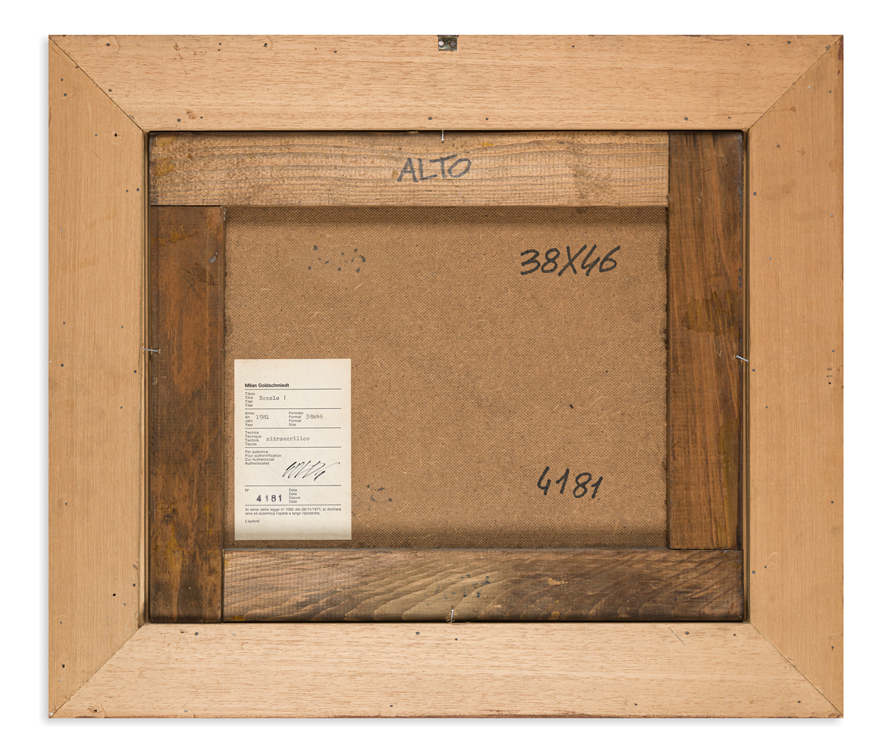 Etichetta dell'Artista al retro con firma, titolo, tecnica, misure e datazione