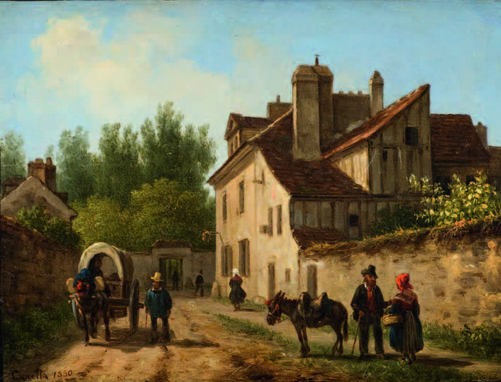 Giuseppe Canella Verona 1788 – Firenze 1847 SCORCIO DI PAESE, 1830 olio su cartoncino applicato su tavola, cm 12x15,5. Firmato e datato in basso a sinistra: Canella 1830