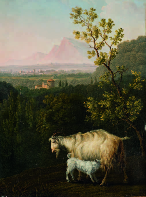 Jakob Philipp Hackert Prenzlau 1737 – San Pietro di Careggi 1807 CAPRA E CAPRETTO IN UN PAESAGGIO olio su tela, cm 37x27,7. Iscritto in basso a destra: JPH [02?]. Provenienza: Inghilterra, Collezione privata L’opera è stata ricondotta alla mano del Maestro dalla D.ssa Claudia Nordhoff in una comunicazione scritta alla proprietà datata Roma, 15 giugno 2005.
