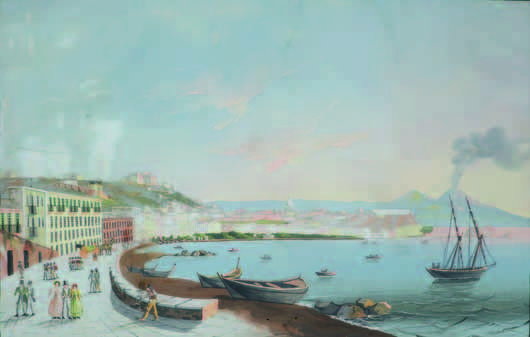 Scuola Napoletana del XIX secolo VEDUTA DI NAPOLI DA POSILLIPO CON IL VESUVIO gouache su carta, cm 36x56 Provenienza: Milano, Sotheby’s, Curiosità teatrali e collezioni sommerse di Franco Zeffi relli, 21/03/2001, lotto n. 249