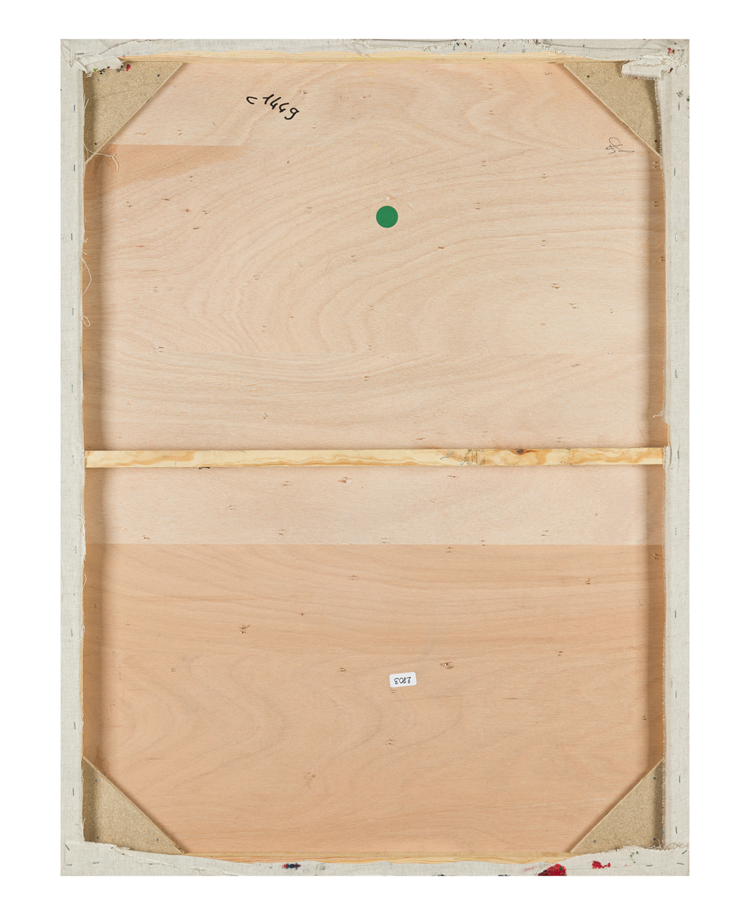 Scarpe tagliate montate su tela riportata su tavola con tracce di colori misti
